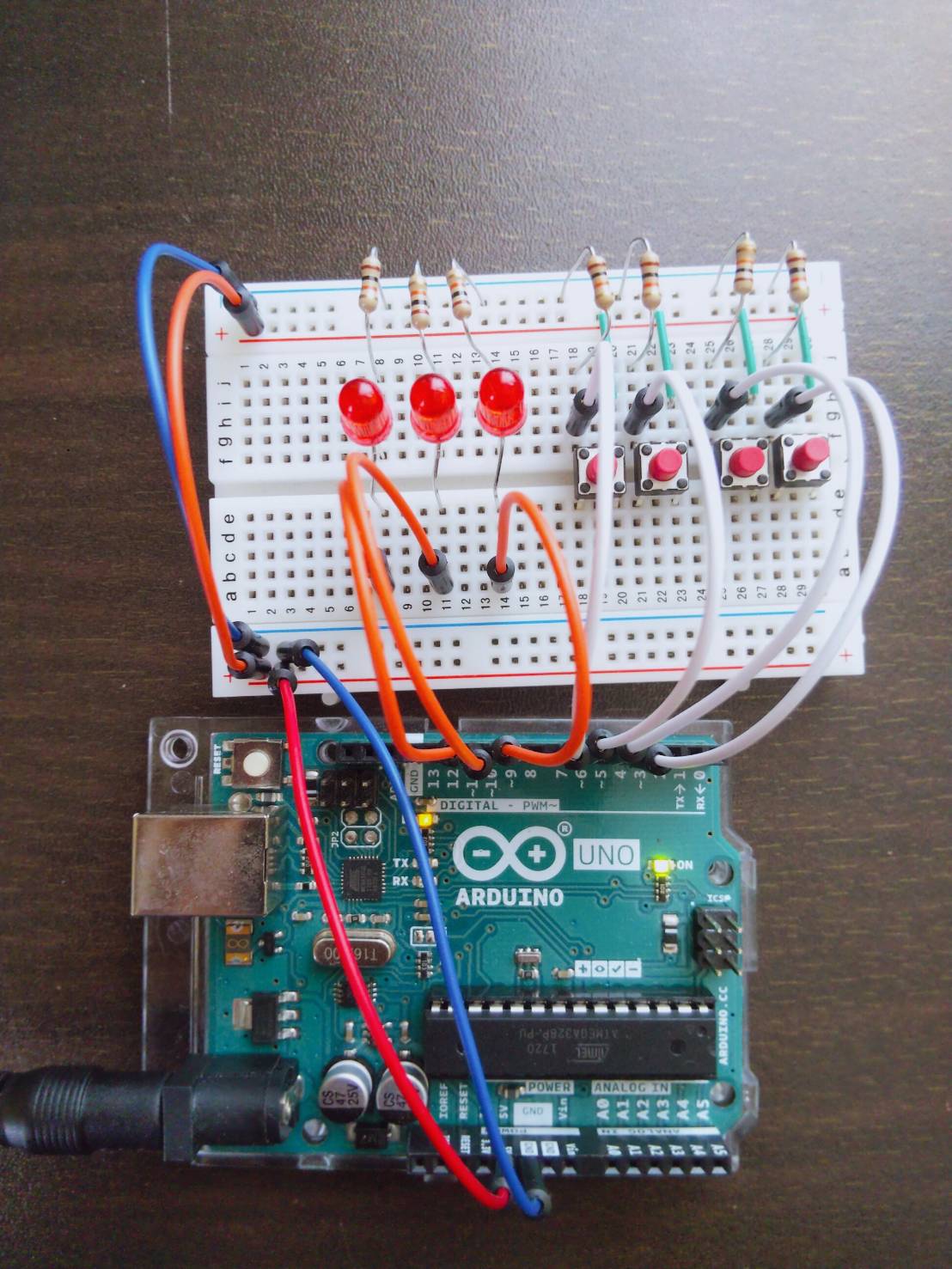 Arduinoとタクトスイッチ(入力)、LED(出力)を使って簡単な足し算ができる計算機を作ってみました。