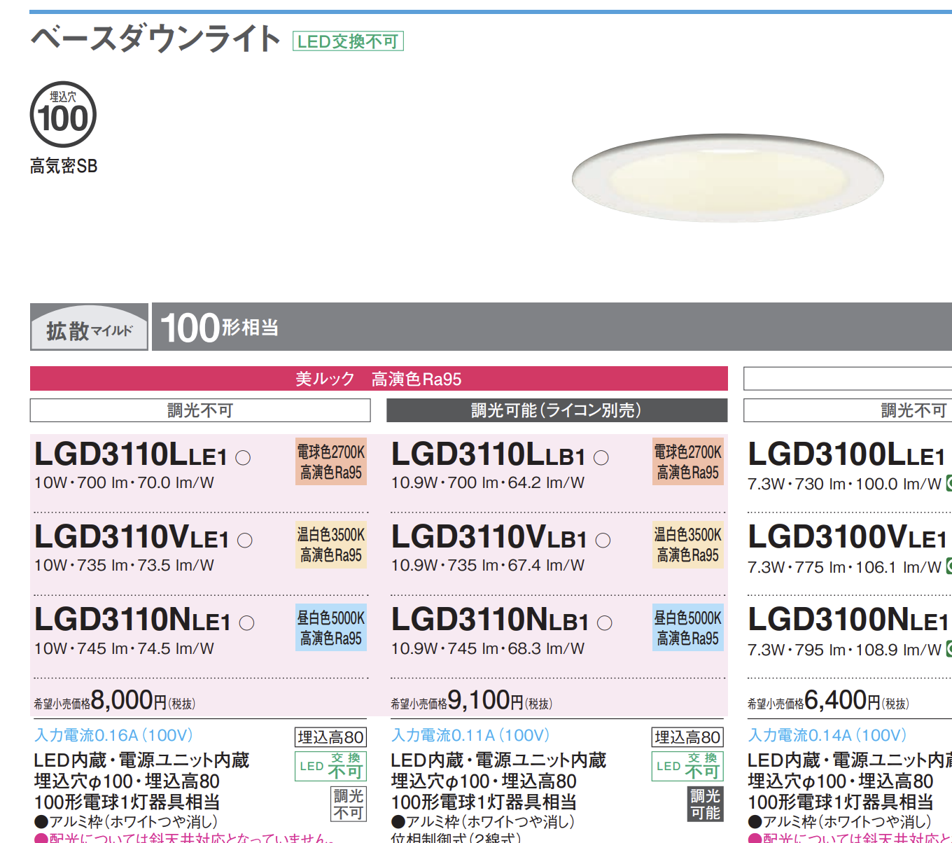 「LE1」の場合は調光不可、「LB1」の場合は調光可、「LU1」の場合は調色、調光可能、な感じです。