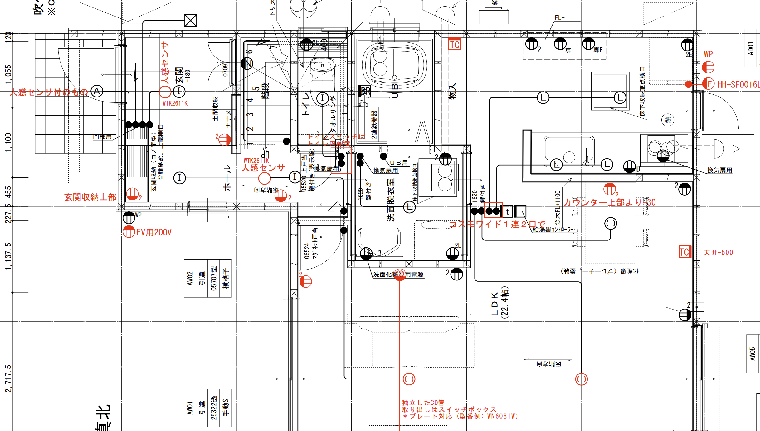 今回は、トイレ回りの人感センサーを「トイレ内」に取り付けたり、階段部と廊下部の人感センサー位置を対面になるように調整した上で、階段部の人感センサーの検知範囲を絞ることで、人感センサーが適切に検知するよう工夫してあります。