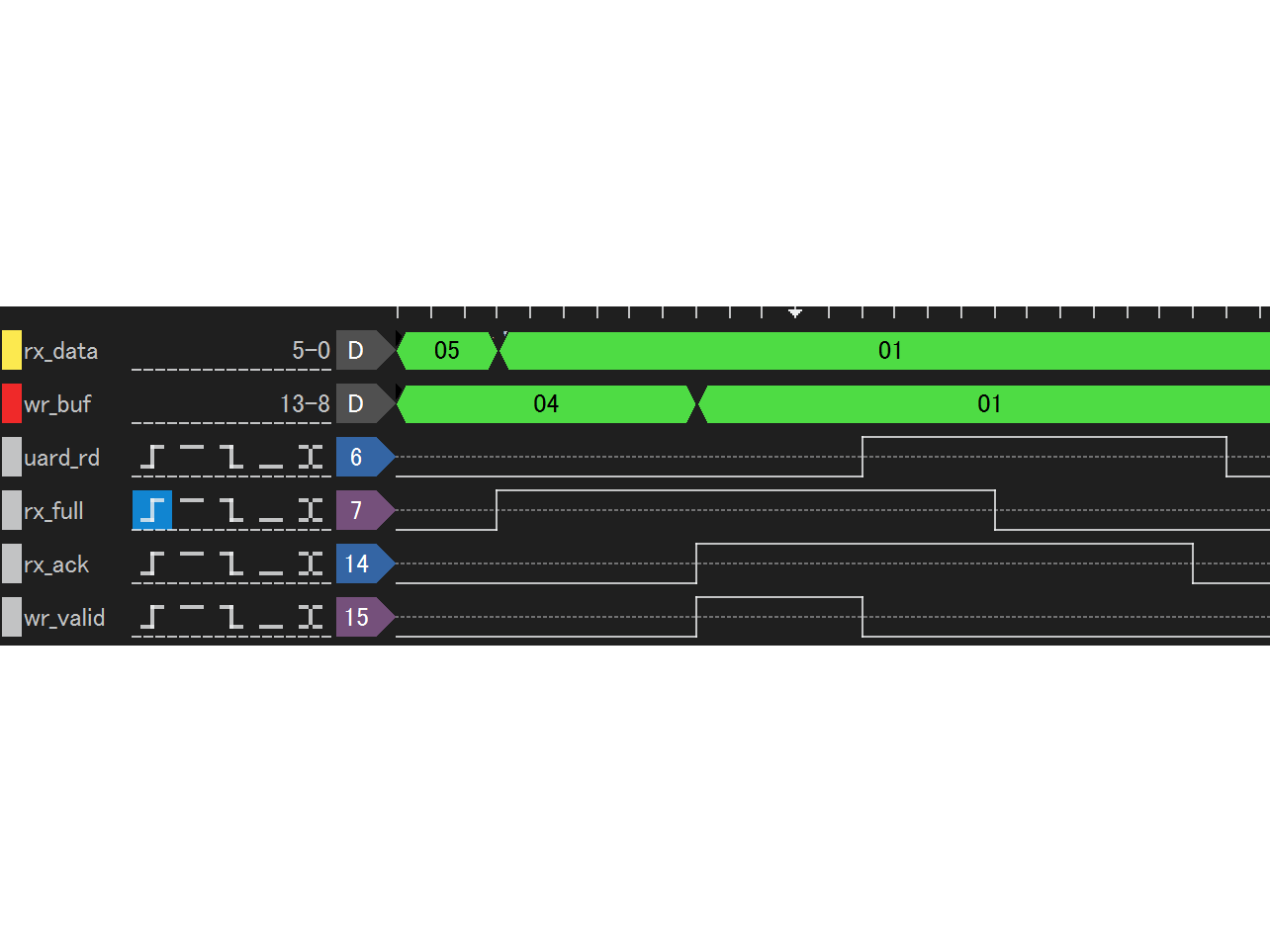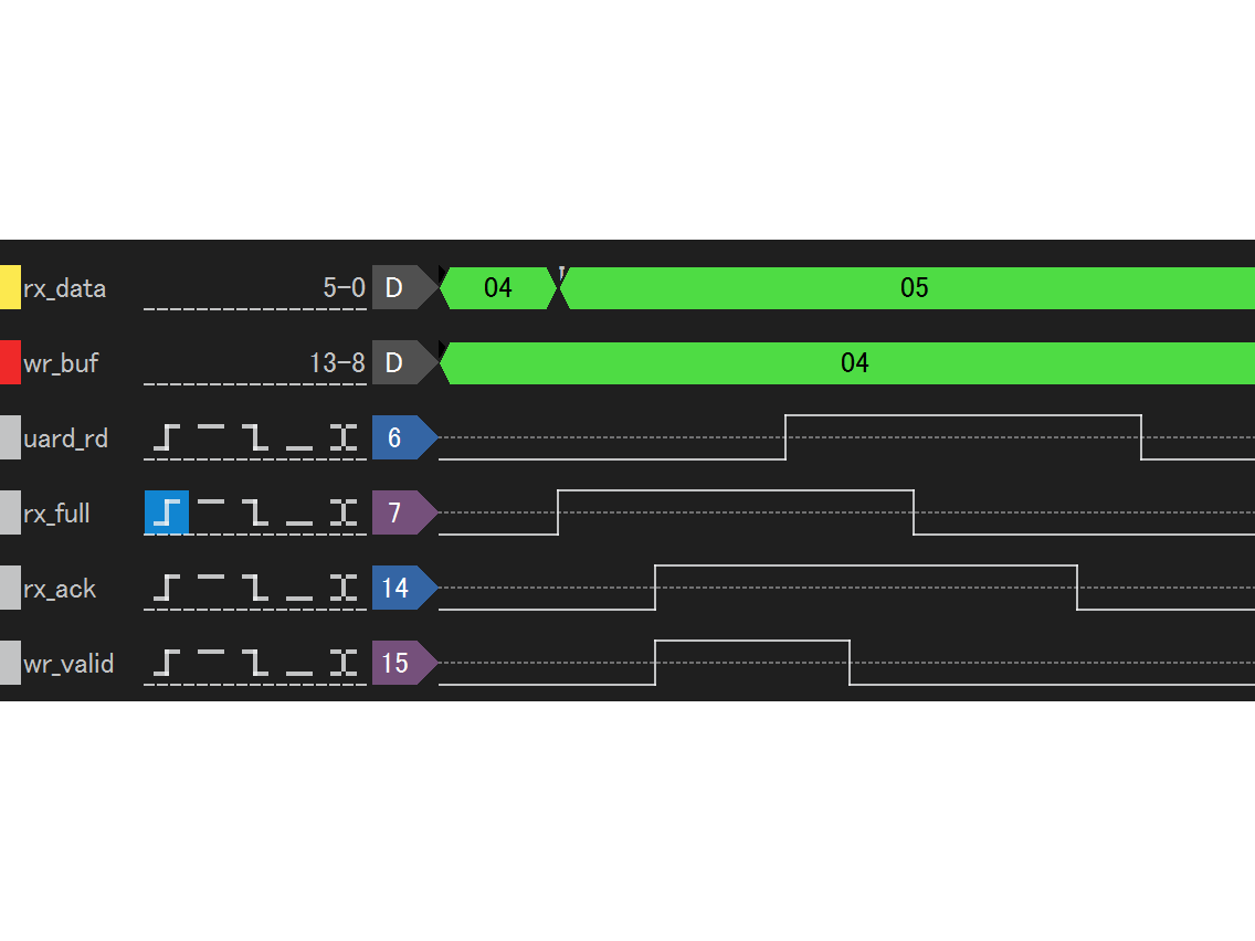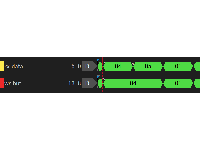 これは元々の問題意識です。rx_data には正常に値が入っていることから、UART からの受信は正常です。しかし wr_buf が更新されていない、あるいは古い値が再び代入されているように見えます。なぜでしょうか。
