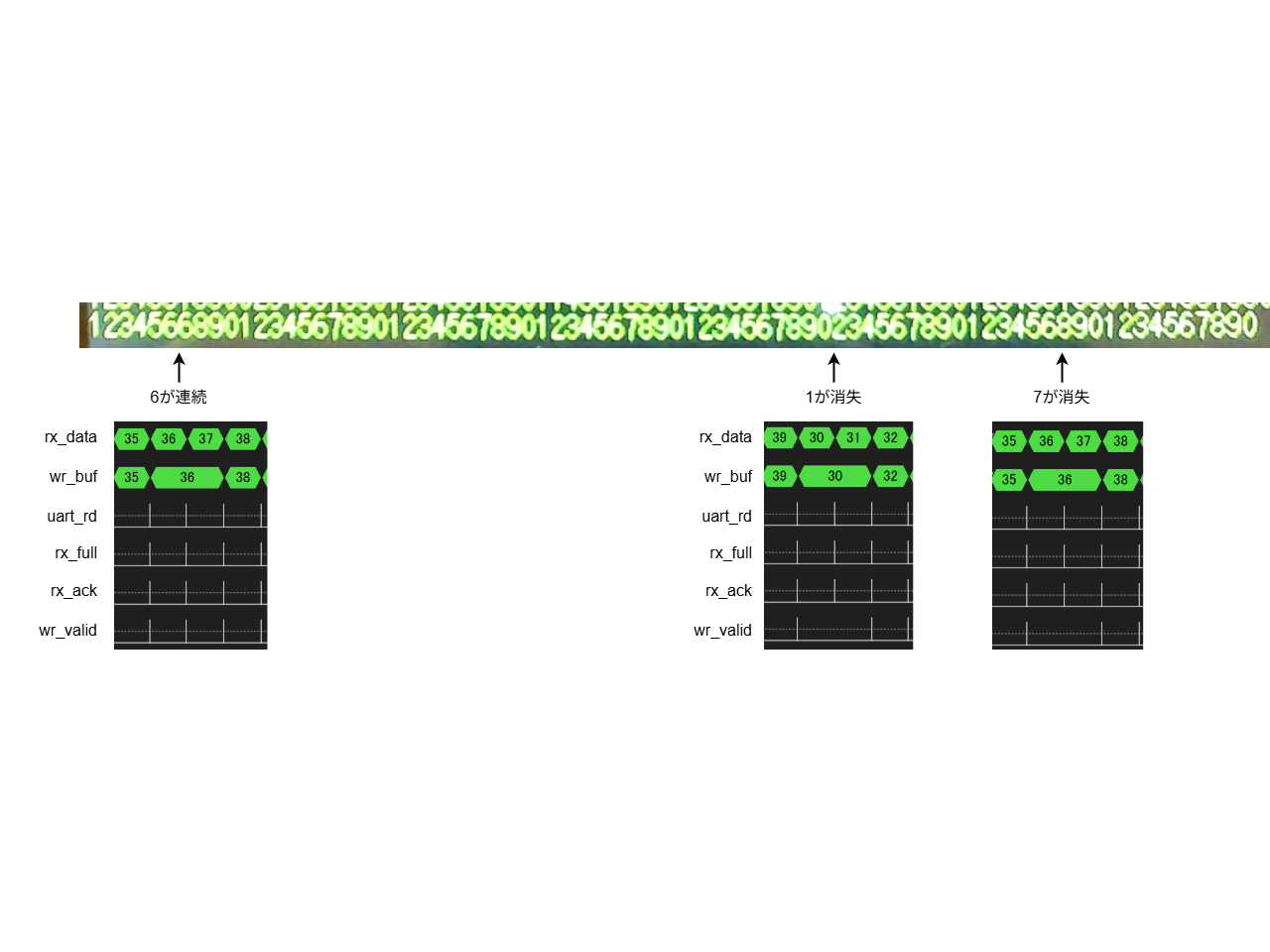 UART受信データ rx_data は正常に受信できています。一方 wr_buf に所々データ化けが見られます。同じ文字が連続する現象が 1 件、1 文字消失する現象が 2 件ありました。同じ文字が連続するケースでは wr_valid が出ていて、文字が消失するケースでは wr_valid が出ていないことが分かります。
