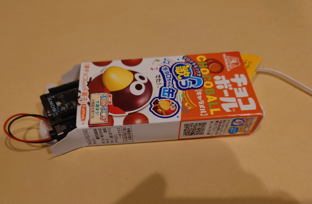 実際に、良いケースがなかったので、子供が食べていたチョコボールの箱に入れてみました。