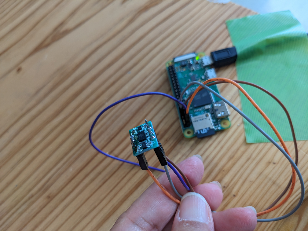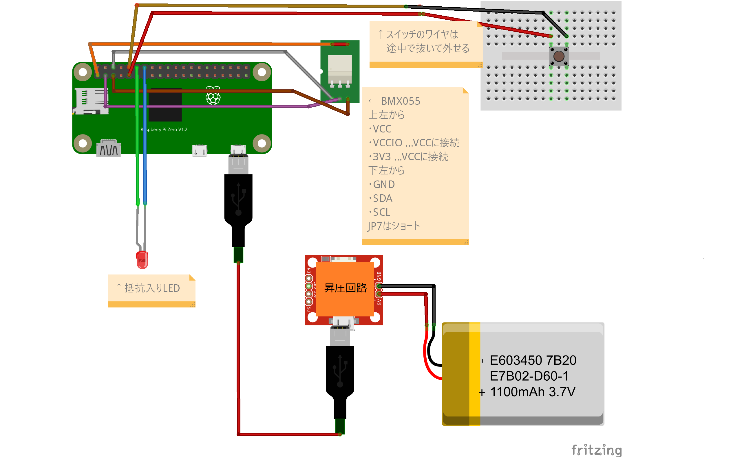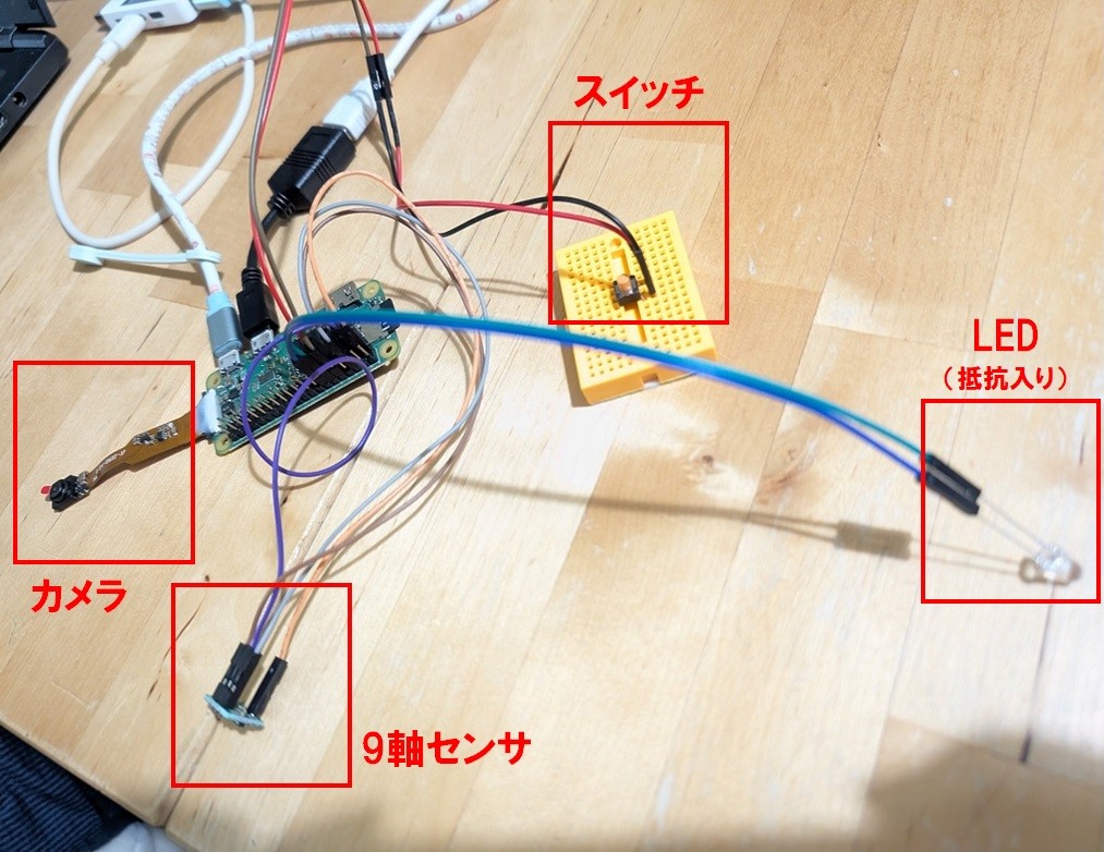 またラズパイは固定具で固定されてしまうため物理ボタンが手の届く位置にくるようにと考えジャンパワイヤの先にスイッチを接続することにしました。また、飛んでいる間の振動でスイッチが意図せず押されたらいけないので、スイッチはONしたあとジャンパワイヤごと抜いてしまい、落ちてきたあとにジャンパワイヤをまた差し込んでOFFにする方式としました。