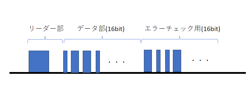 データ部はNECプロトコルは確か8bitですが、今回は16bitにしたので、0~65535のデータを扱うことができます。つまり6万通り以上の信号を用意することができるので、操作したい機器が多少増えても信号割当てが足りなくなるということはきっと無いはず!もし足りなくなったらビット数増やしてください。