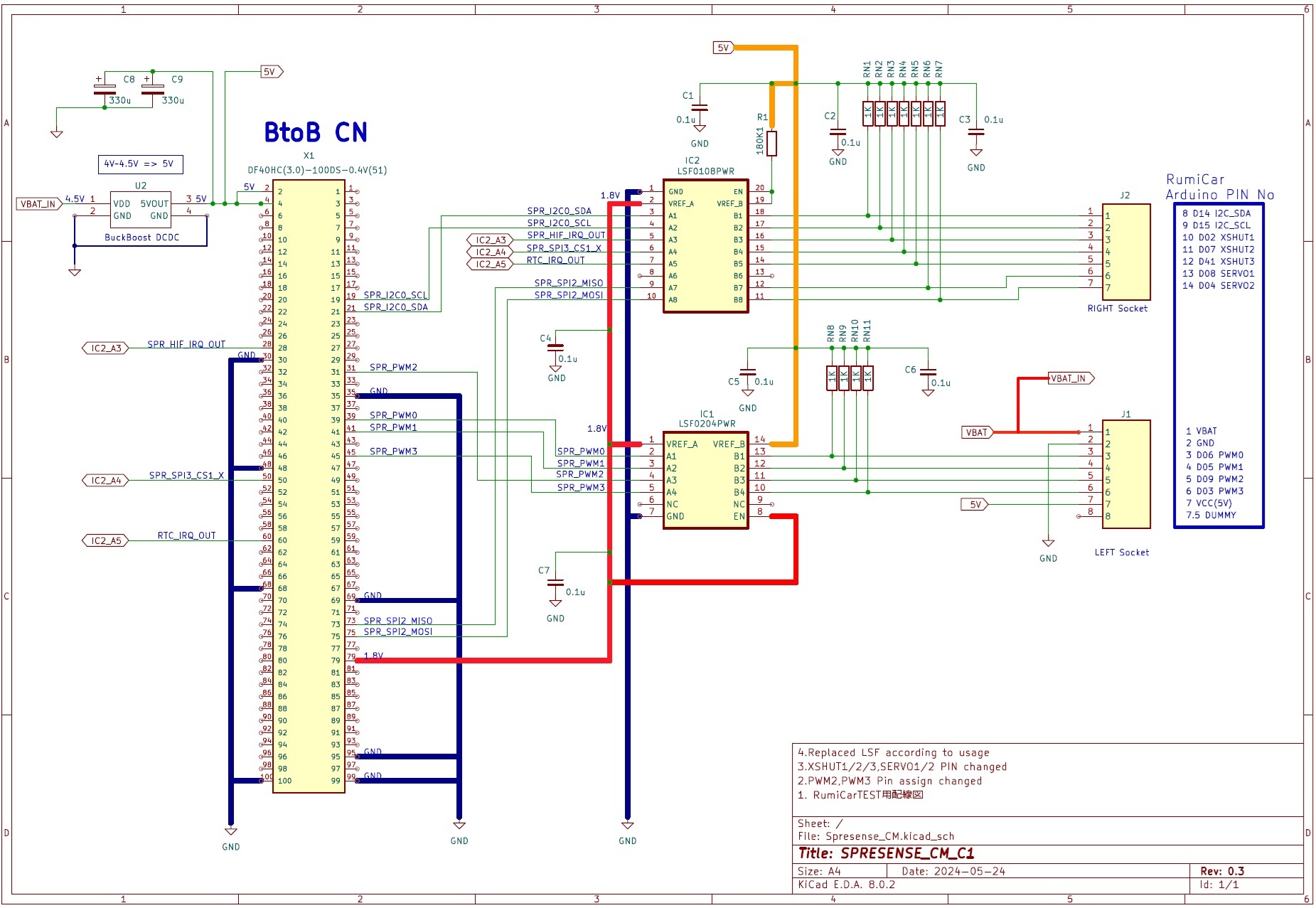 I/O電圧が1.8Vと先進的過ぎて世の中の周辺機器がまだSPRESENSEの規格に追いついておらず、従ってSPRESENSEで利用できる周辺機器はそのI/O電圧の制限から選択肢が非常に限られ結果採用事例の増加阻害要因でした。このたび簡単な回路と少ない部品でSPRESENSEに5V系の従来周辺機器を接続してI2C通信やPWMなど汎用的に使われている技術をベースとした利用形態を安定的に実現しました。この実例を広く公開することにより世の中の参考とすることによってI/O電圧の問題を克服できずにSPRESENSEの採用を諦めていたユーザーの問題解決に繋がりSPRESENSEの採用事例が増大することを期待します。作成した基板は乾電池で動作する自動走行車であるRumiCarで実際に展示会やハンズオンで多数使用可能レベルの安定したものであるし、またこのモジュールは脱着交換可能であって、このモジュールをそのまま別の基板等に組み込んだり装着すればSPRESENSEを使いながらなんら追加変更不要で現行の5V系の周辺機器の利用が可能になったり簡単にPWM機能が利用できる優れものです。本回路の小変更で3.3V系への対応も容易です。乾電池とモーターで動作する自動車、戦車、ドローン、飛行機などに広く応用可能です。IoTや電子工作にて他の利用者がこのモジュールをそのまま使って頂いても良いのでSPRESENSEの利用分野が広がると嬉しいです