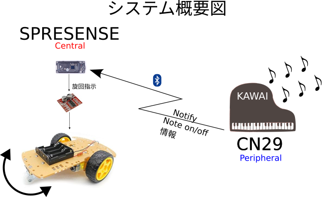 なので、これとBLE機能を持ったSPRESENSEを使ってピアノと連携した事をできないか思い取り組む事に