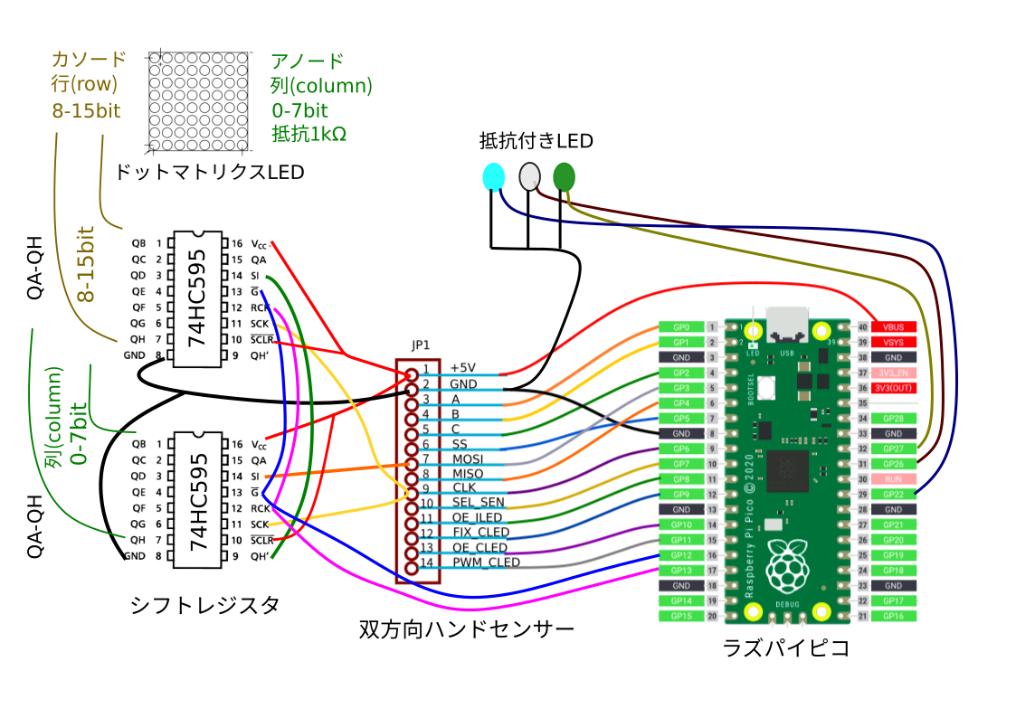 Raspberry Pi PicoのMicroPythonでは図のように表示する8ビット数を長さ8の画像リストに保存します。次に行を変化させながら1行ずつ表示関数を実行します。この関数はSPIで2バイトの行、列データをシフトレジスタに送信し1行書き込みます。タイマー割り込みでこれを連続的にコールし、処理を自動化しています。