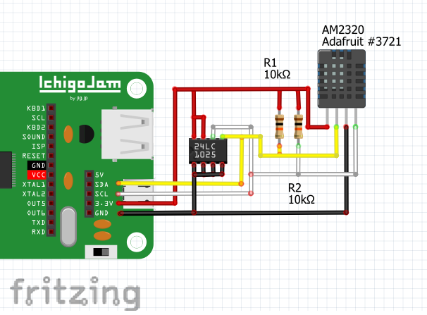 この回路図ではAM2320とROMは単体の部品を使っていますが、いちごジャムPC用として売られている拡張メモリを使う方が手軽です