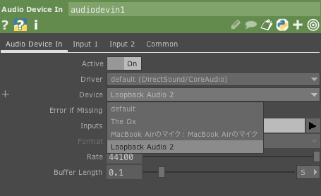 一方でTouchDesigner側でAudio DeviceとしてLoopbackを選択することで、Webブラウザの音を入力として扱うことができます。