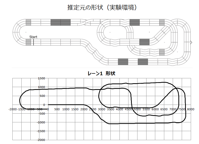 機械学習をする、しないに関わらずコース上でのコース形状の同定と自己位置推定が出来る必要があります。コース形状の同定はジャイロセンサの値とタコメータの値があれば容易で、スタート地点からの移動量をプロットすればよいです。実験環境でコース形状を同定したときの結果が次のようになります。