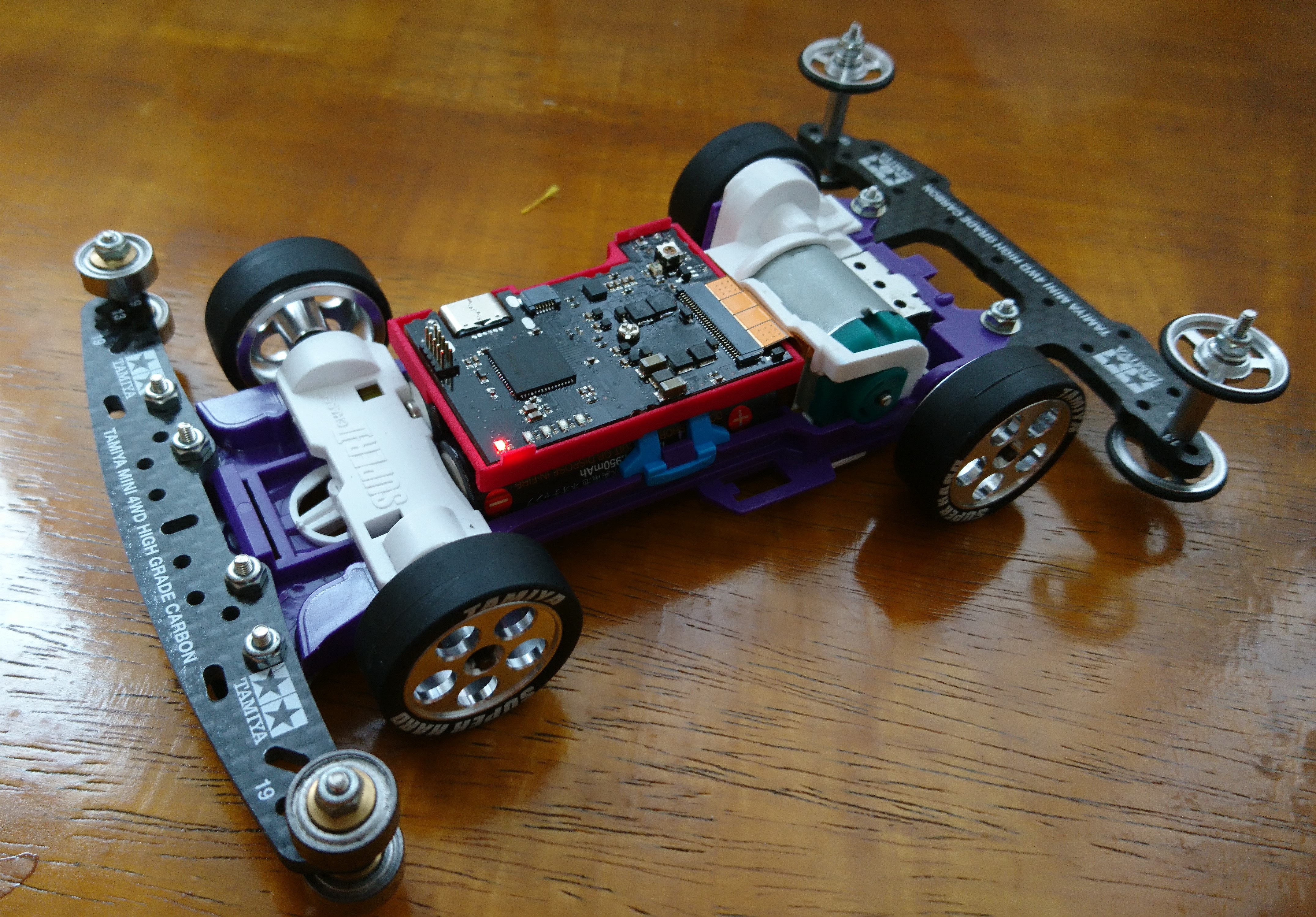 ミニ四駆AIでは、基本的に走行用バッテリ(単三乾電池2本)でモーターが回れば後は何やってもいいというルールになります(コースを走る前提なのでサイズ等はタミヤのミニ四駆レギュレーション準拠)。外部との通信や外部定点カメラの設置などもルール上OKになりますが私は趣味の問題で、1.走行用バッテリを使って制御装置を動かす、2.外部機器を使用せずオフラインで完結するという2つの縛りをもって参戦しています。
