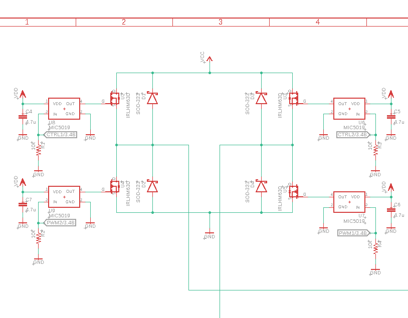 モータードライバはミニ四駆を走らせるための核心部品で、うまく作らないと速く走れません。私が作ったものは一般的なHブリッジのモータードライバですが、Hi側もLo側もN-ch Power MOS FETを使用しています。電源電圧が2-3V程度なのでPchのゲートを開けるのが大変そうだったため、昇圧できるN-ch用ゲートドライバを使用することにしました。