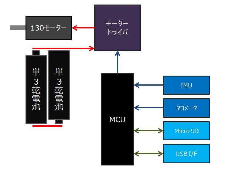 競技者によって制御装置の作りは違いますが、私の場合にはモータードライバ、センサ、MCU、電源などを1つの基板に実装しています。回路図全部説明しても読みたい人いないと思うのでブロック図を描きます。