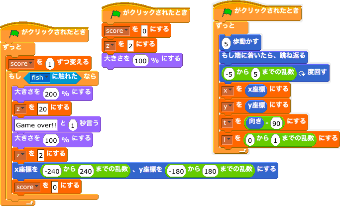 今度は、お魚になって、ネコちゃんから逃げるゲームを作ってみます。