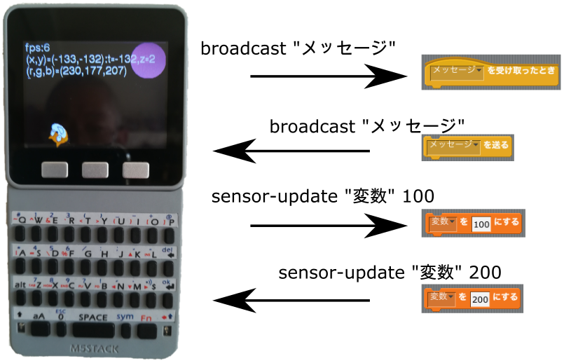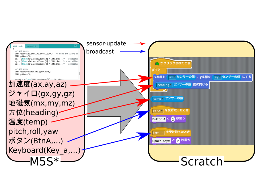M5SからScratchへの情報伝達は、以下の図のようになっています。