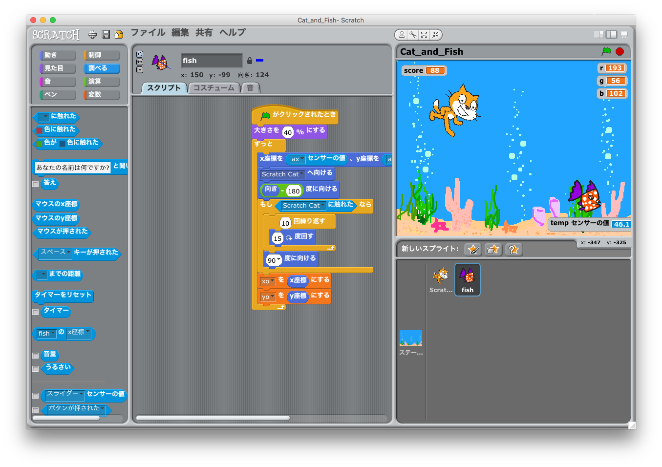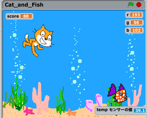 加速度センサーなどを使って、Scratch側のスプライトを動かすと、色々なプロジェクトが作れそうで、楽しいです。