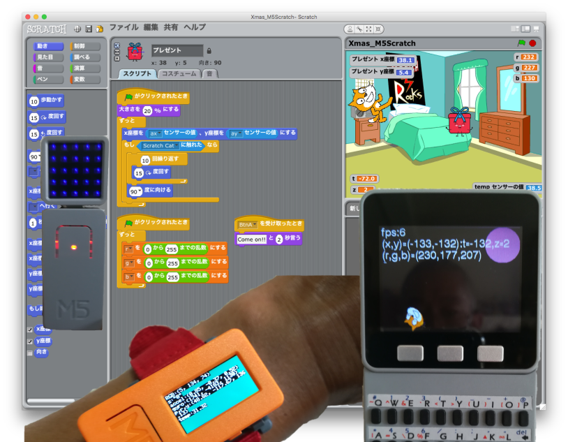 このデモでは、円周上をぐるぐる動いているScratch Cat(ネコちゃん)に、M5Sの加速度センサーを使ってプレゼントを操作することでネコちゃんにプレゼントを届けています。