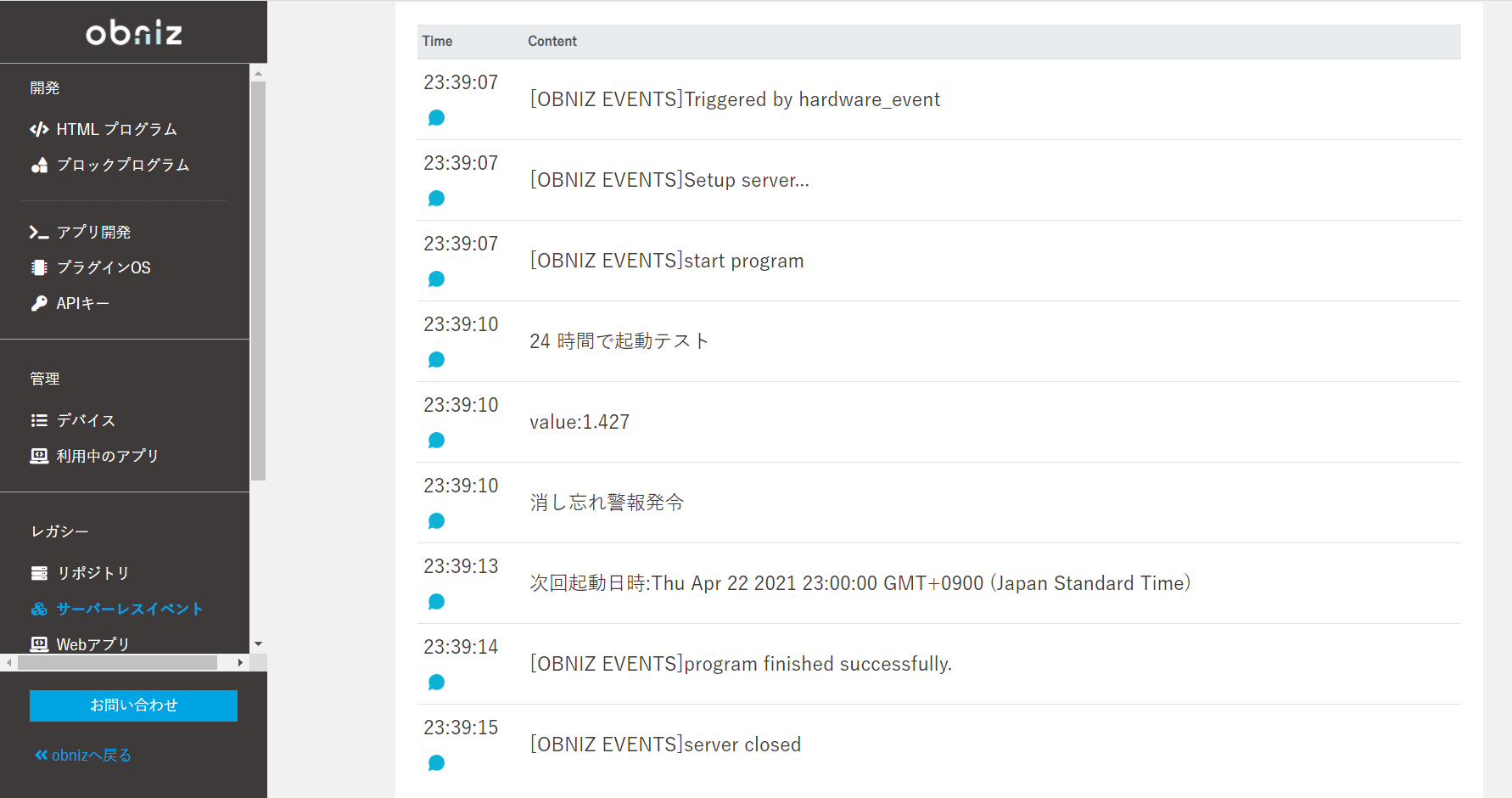 ②レガシー > サーバーレスイベント に トリガーを「obniz Hardware Event」、実行するアプリケーションに①を設定して作成。