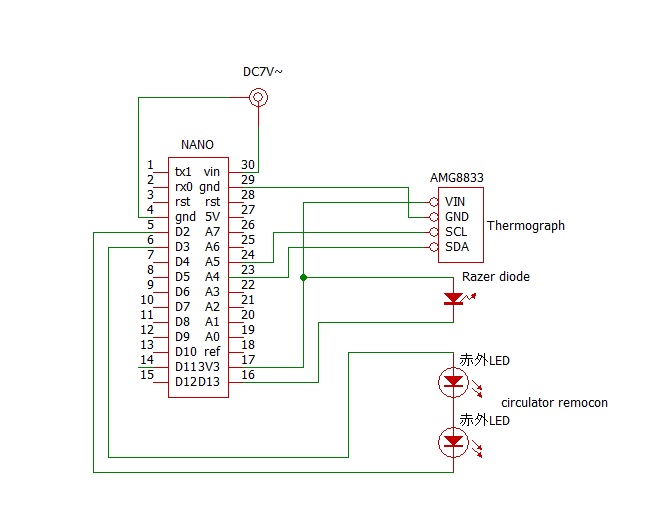 と・・・・首振りがリモコン式のものはかなり簡単にできそう・・・実際リモコン送信赤外LEDとサーモグラフだけで完成(>_<)。上下左右に自動追尾します。回路図と実際の映像 ソース ご参考です。(当初ジャイロを積んで姿勢制御に使おうとしましたが、うまくいかず未使用です)
