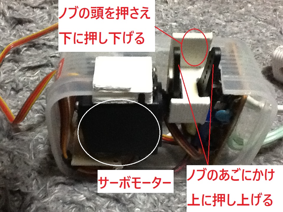サーボモーターとノブ押し上げ下げ機構(苦労してたどり着いた形状 白い樹脂は3Dで制作)