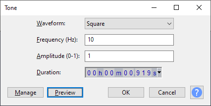 ・Frequency(周波数):10 Hz (サウンドカードにはローパスフィルタが入ってるから10Hz以下はあまり出力できない)