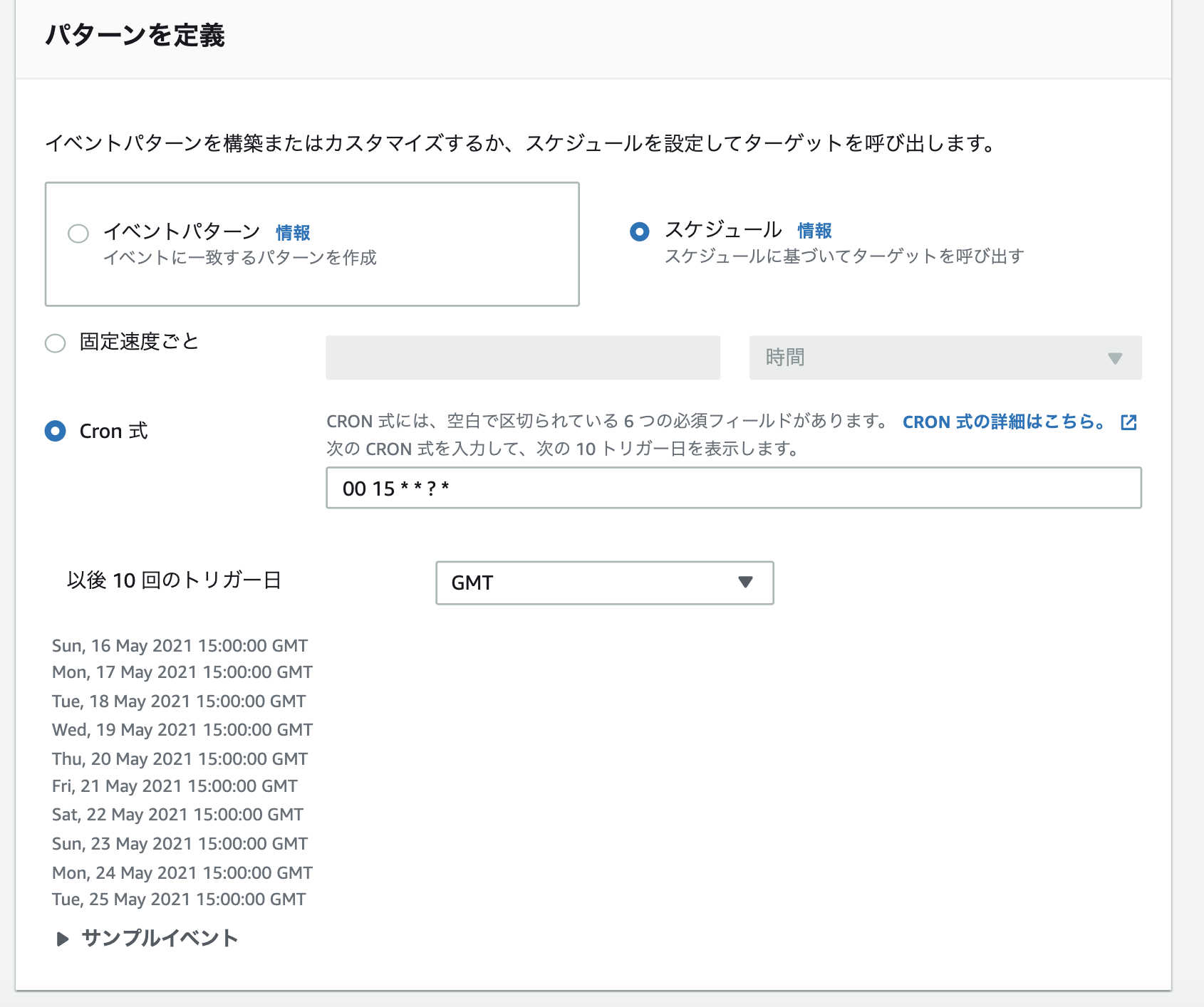 今回はGMT基準で動かしているので時差計算をして15じになったら起動するようにしています。