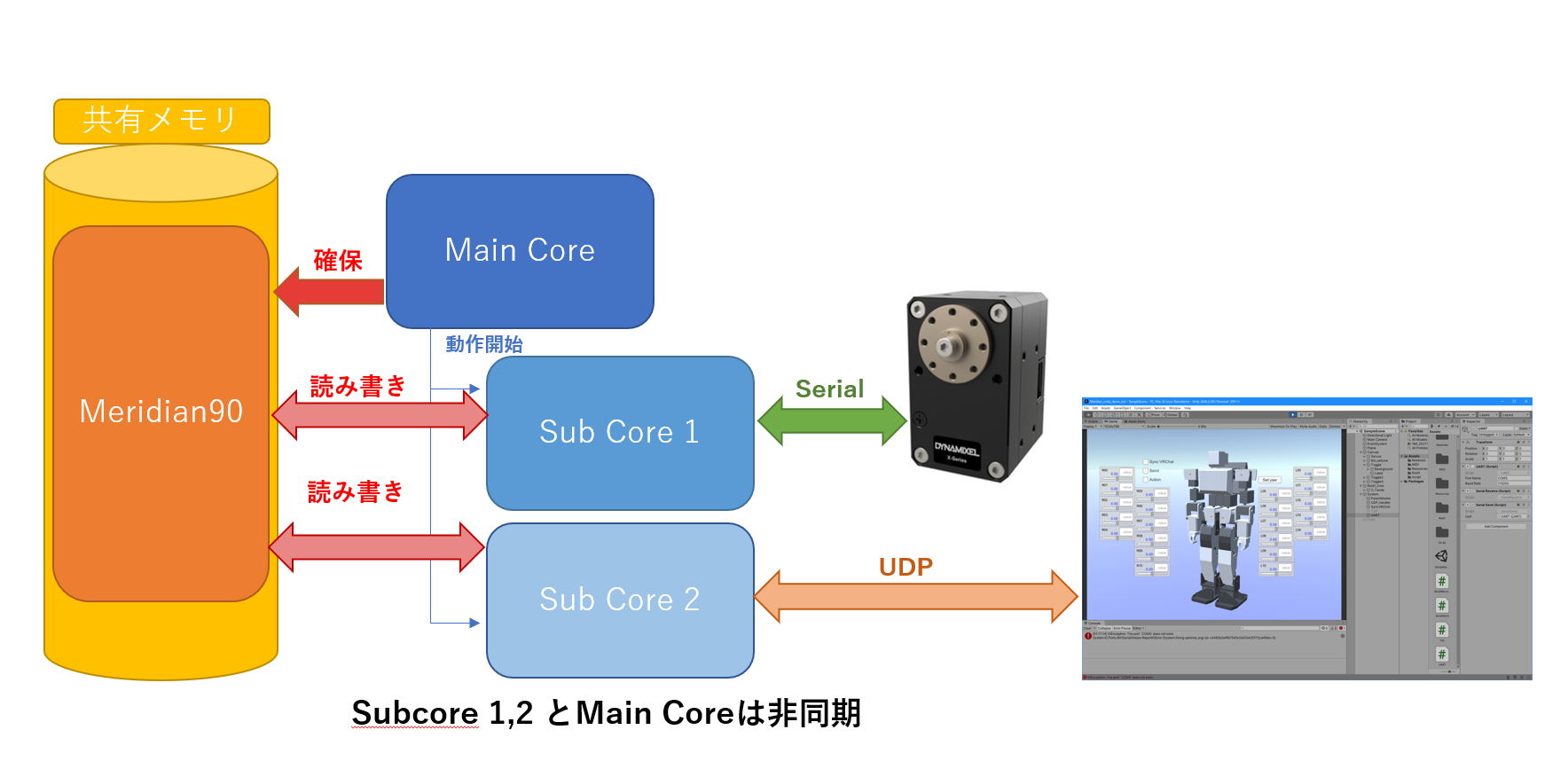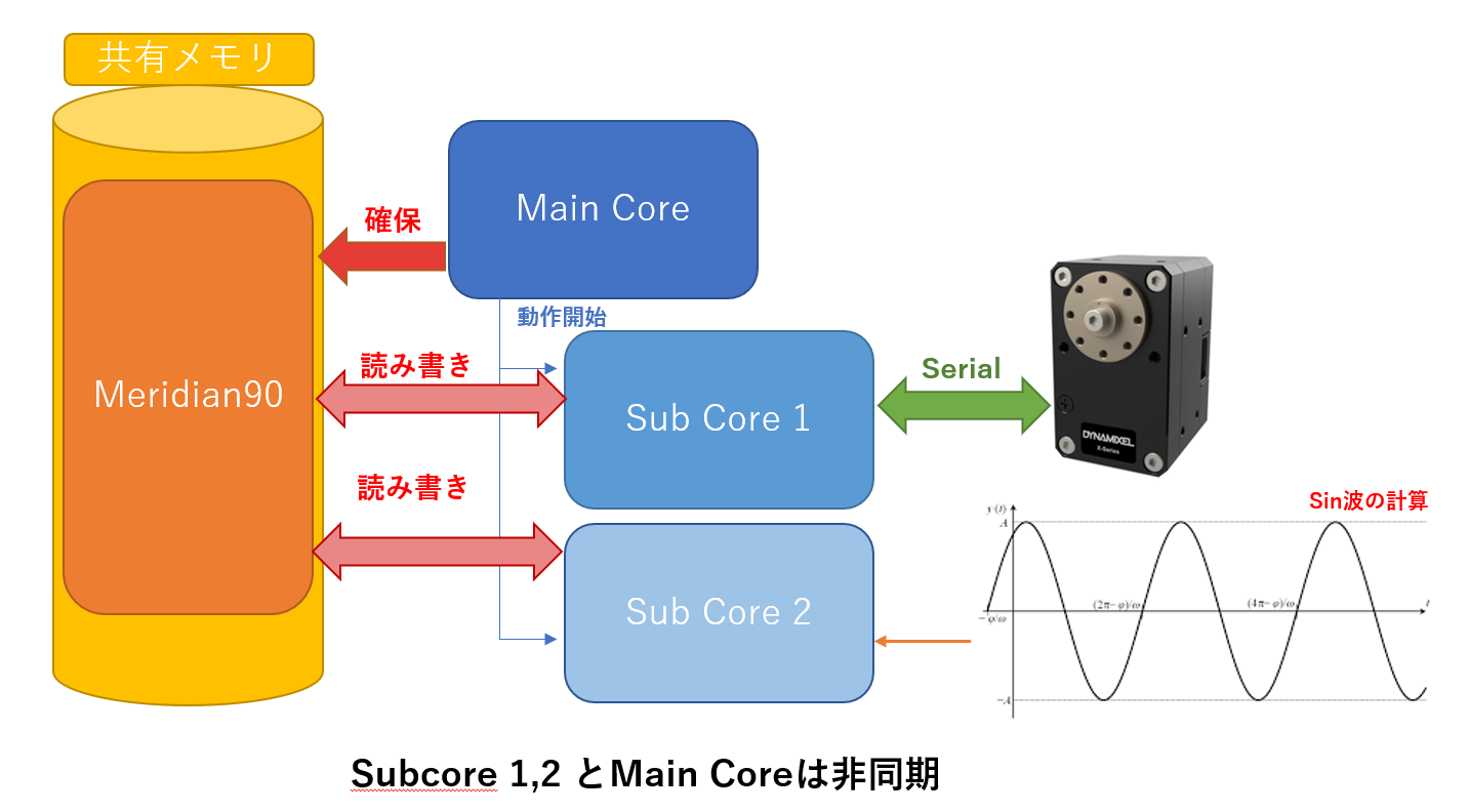 共有メモリを用いて、サブコア同士でMeridianプロトコル(Meridian90)の情報を共有出来ることを利用し、モーターの計算と、モーターとの通信の2つのプロセスをマルチコアで分担させ非同期でかつ、それぞれの最速の処理速度で実行させる。