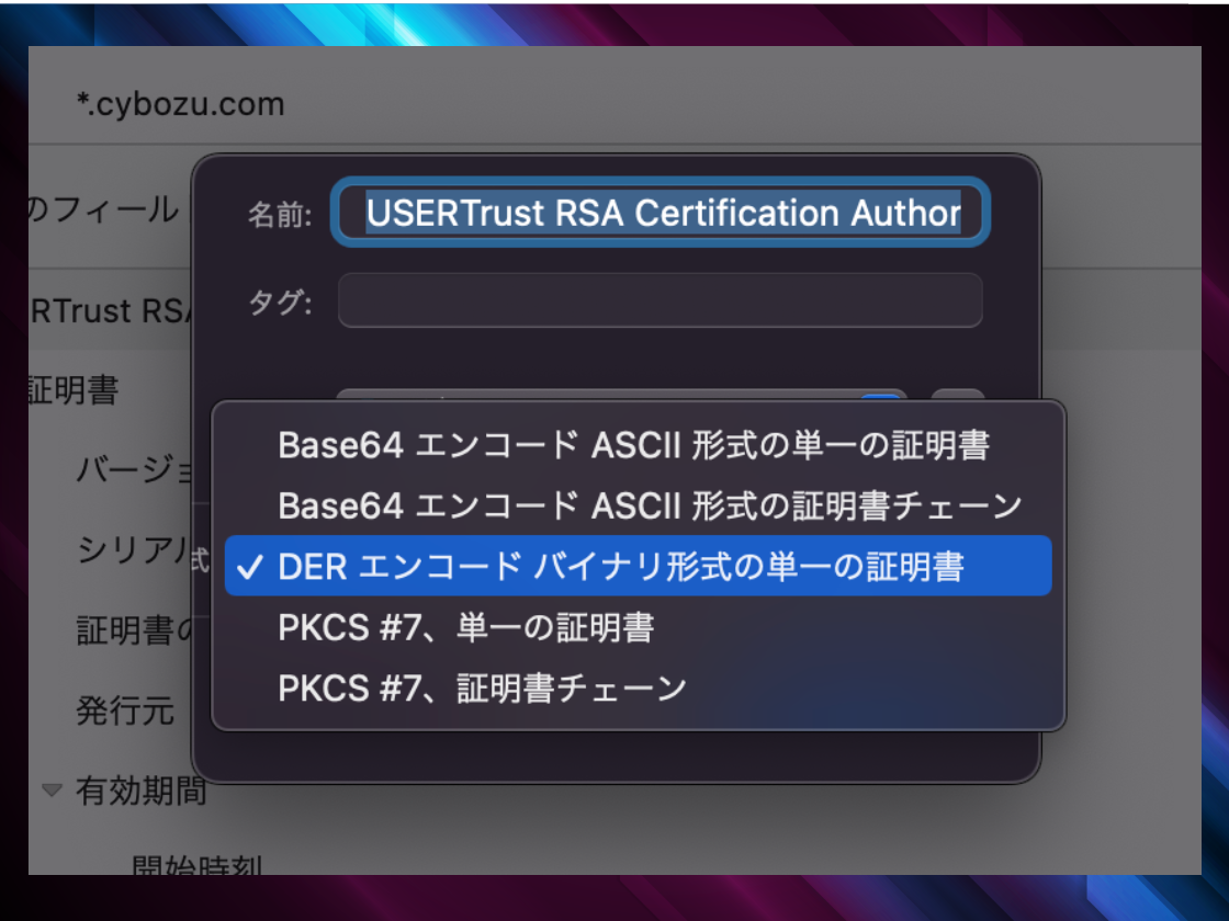 保存方法が色々と提示されますが、その中から「DER エンコードバイナリ形式の単一の証明書」を選んで保存します。
