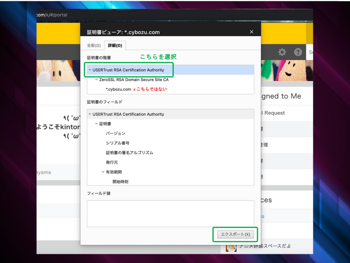 続いて「詳細」タブを選択し、一番上のCertification Authorityと記載されてる箇所を選択します。この状態で下のエクスポートボタンをクリックします。このページではデフォルトで違う箇所が選択されるので、間違えてそちらをエクスポートしないように気をつけてください。Certification Authorityと記載されてる方をエクスポートしてください。