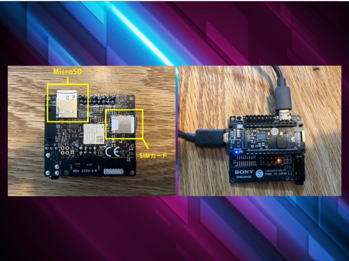SDカードに保存が出来たら、SDカードをSpresenseのLTE拡張ボード内に差し込みます。LTE拡張ボードにも電源供給をします。