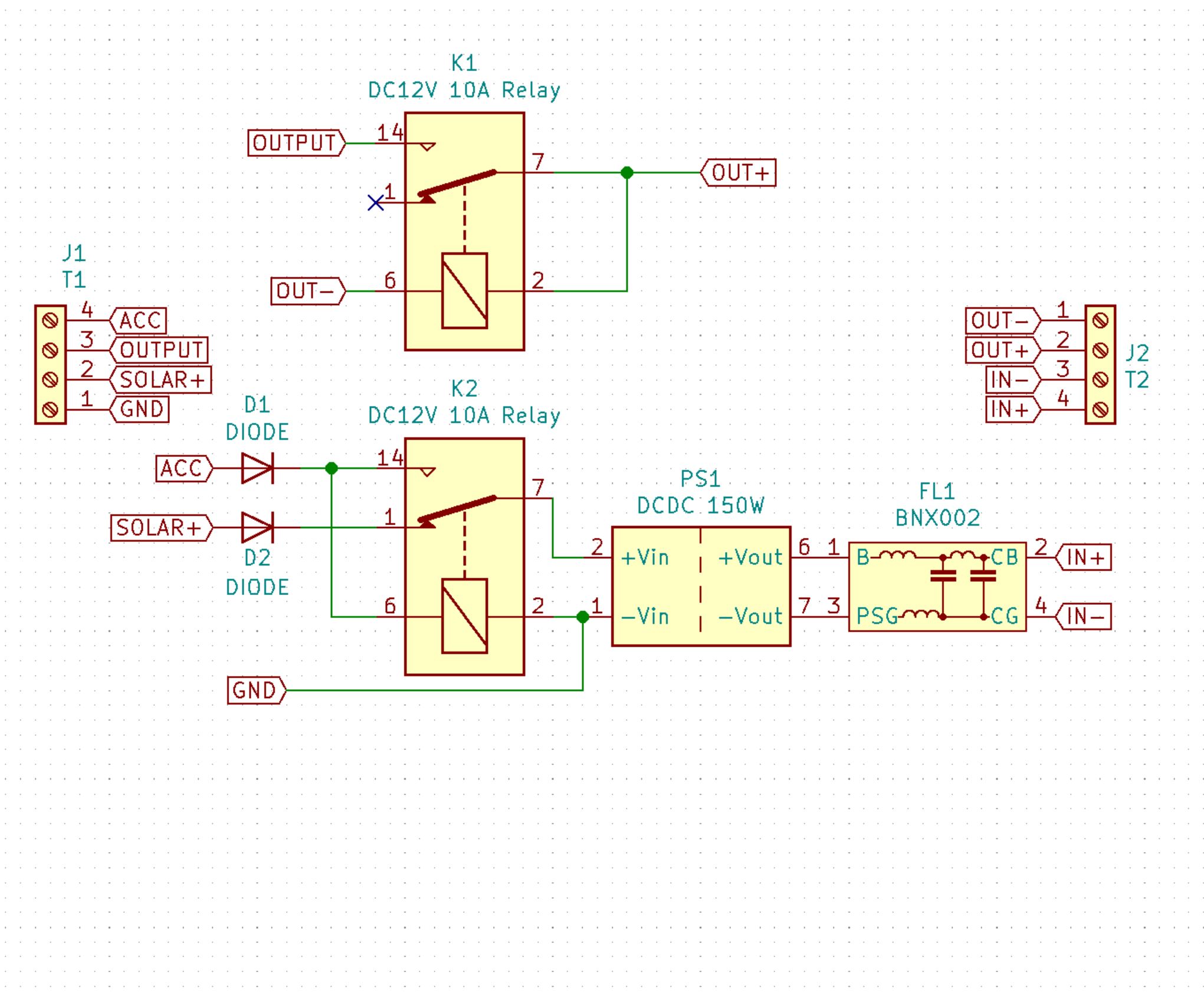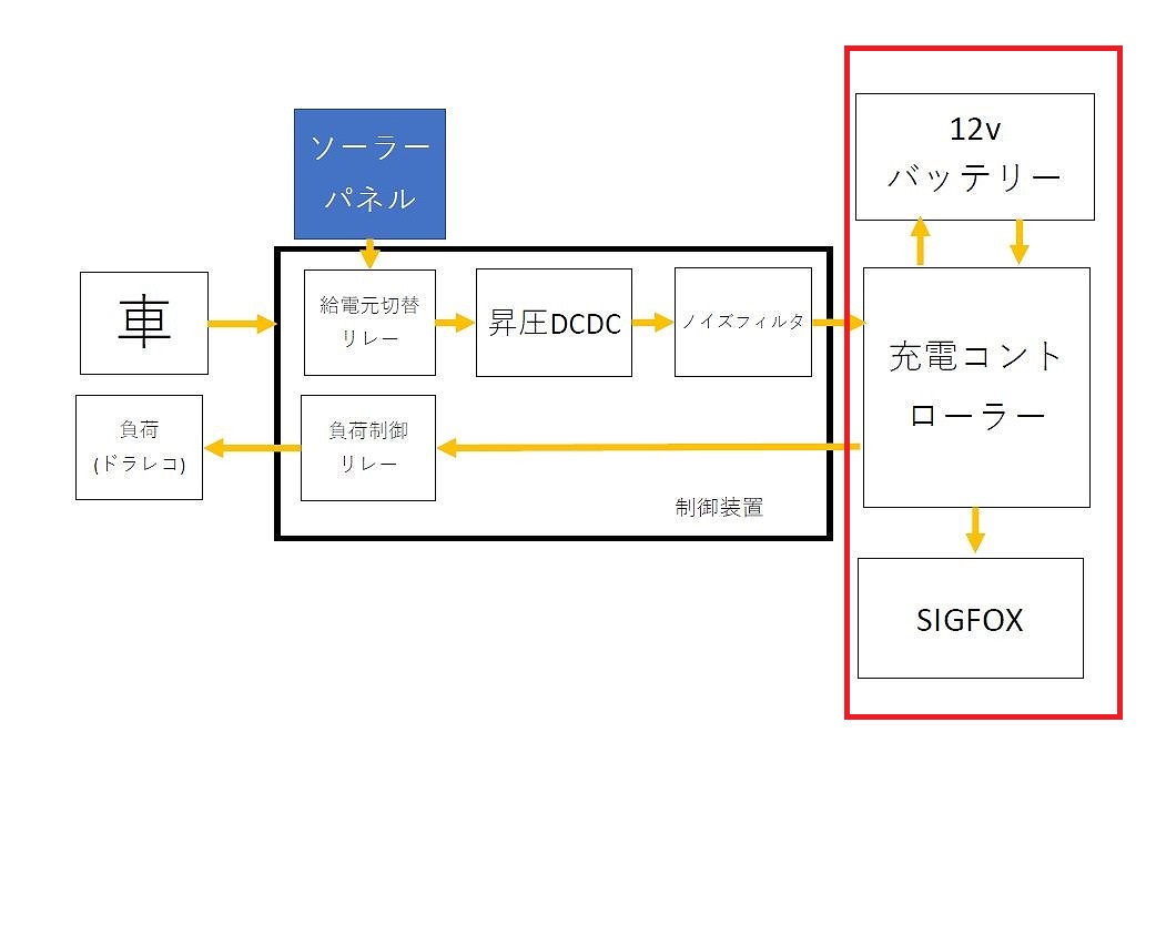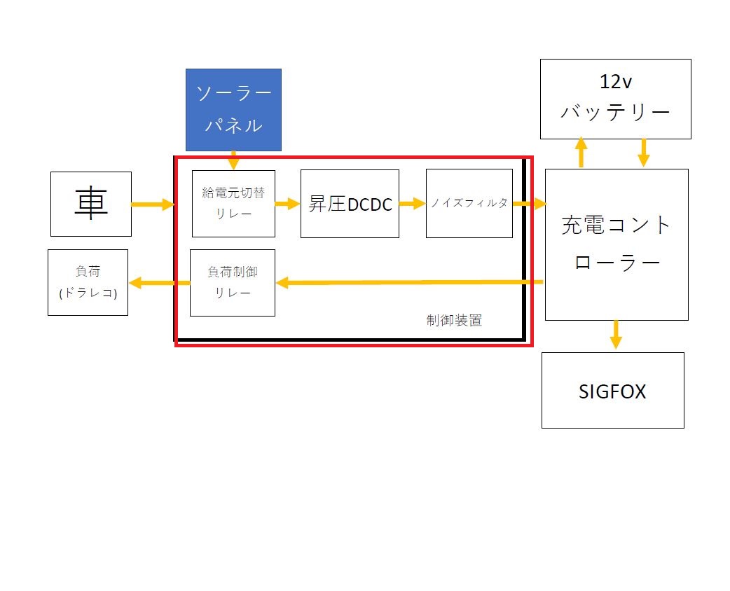 給電元の切替は、リレーを用いて、エンジン駆動時は、車から給電するように、それ以外は太陽光パネルから給電する様に切り替えます。