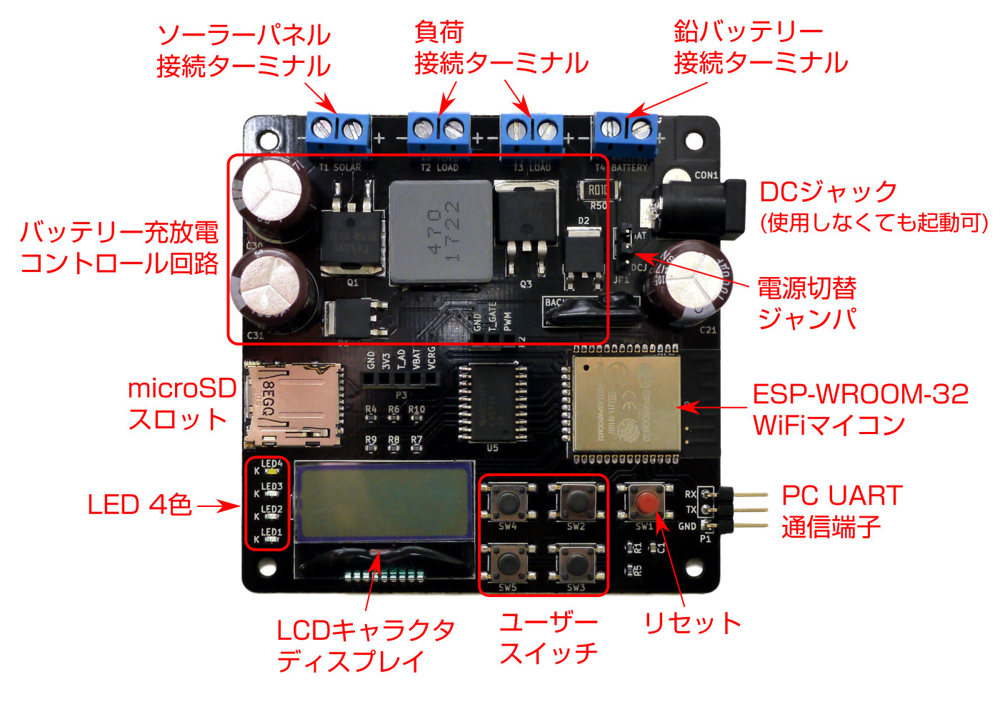Arduino IDEで動作を自由にプログラミング可能な、IoTソーラーチャージャー基板です。WiFi内蔵マイコンであるESP32(ESP-WROOM-32)を採用しました。鉛バッテリー充放電回路、microSDスロット搭載。状況にあわせた充電、負荷の接続/切断ができ、ネットワークからのモニタリングも可能です。