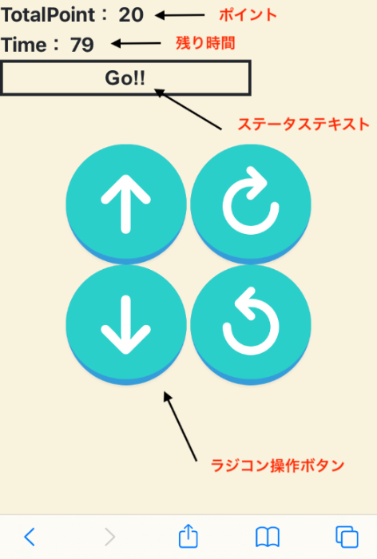 ラジコンカーをスマホで操作する&ゲーム画面を作成します。こちらはCSSなどを利用してボタンに高級感を出しています。