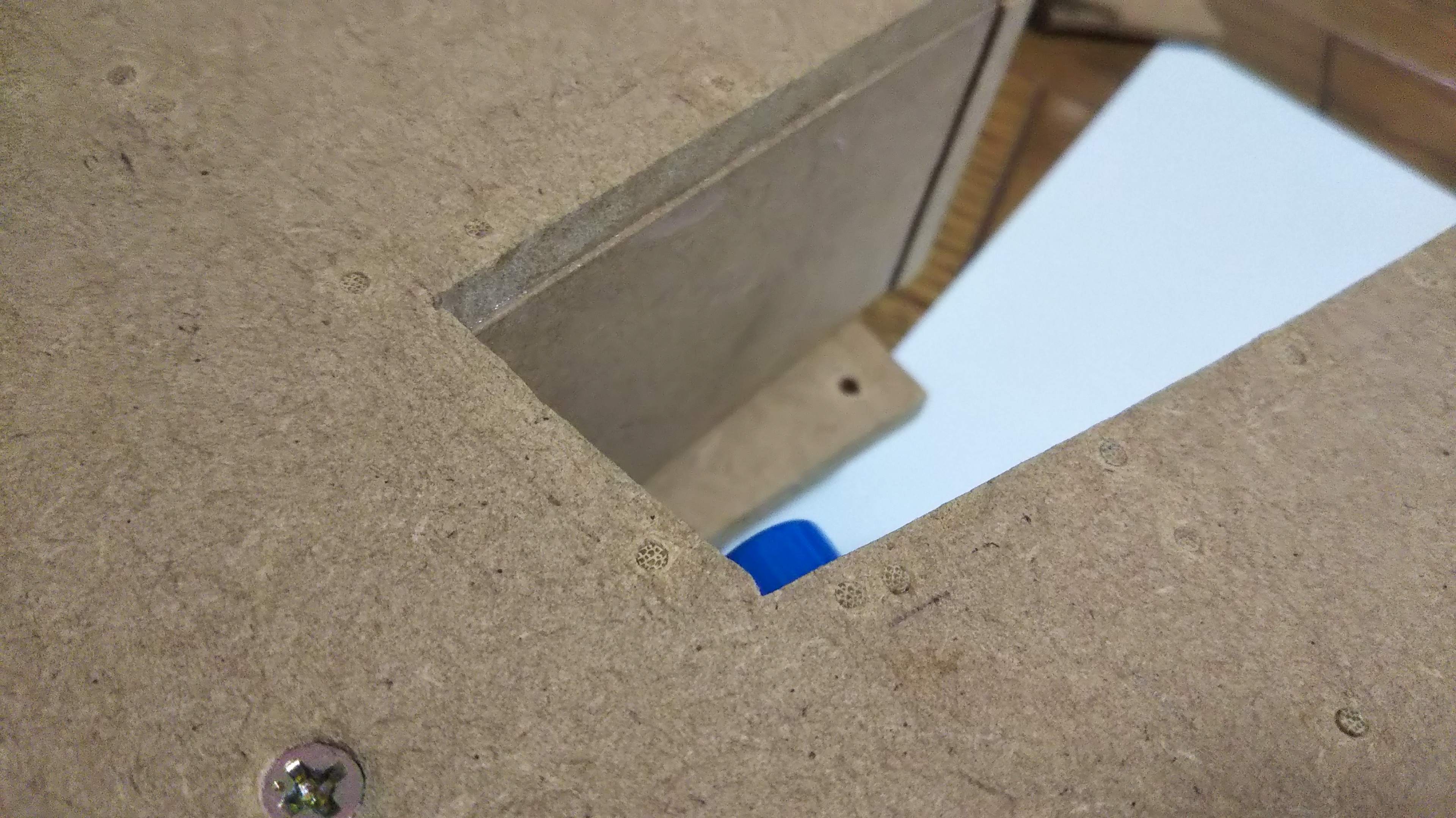 少し見づらいですが板の表面に丸い模様があるのが見えるでしょうか。これは竹ひごの断面です。この外枠はMDF材(木目のない木の板)でできていて基本的には木工用ボンドで接着しているのですが、それだけでは強度に不安があったので辺にドリルで穴を開けて竹ひごを入れてあります。強度の向上を期待していますが、どこまで効果があるかはわかりません。