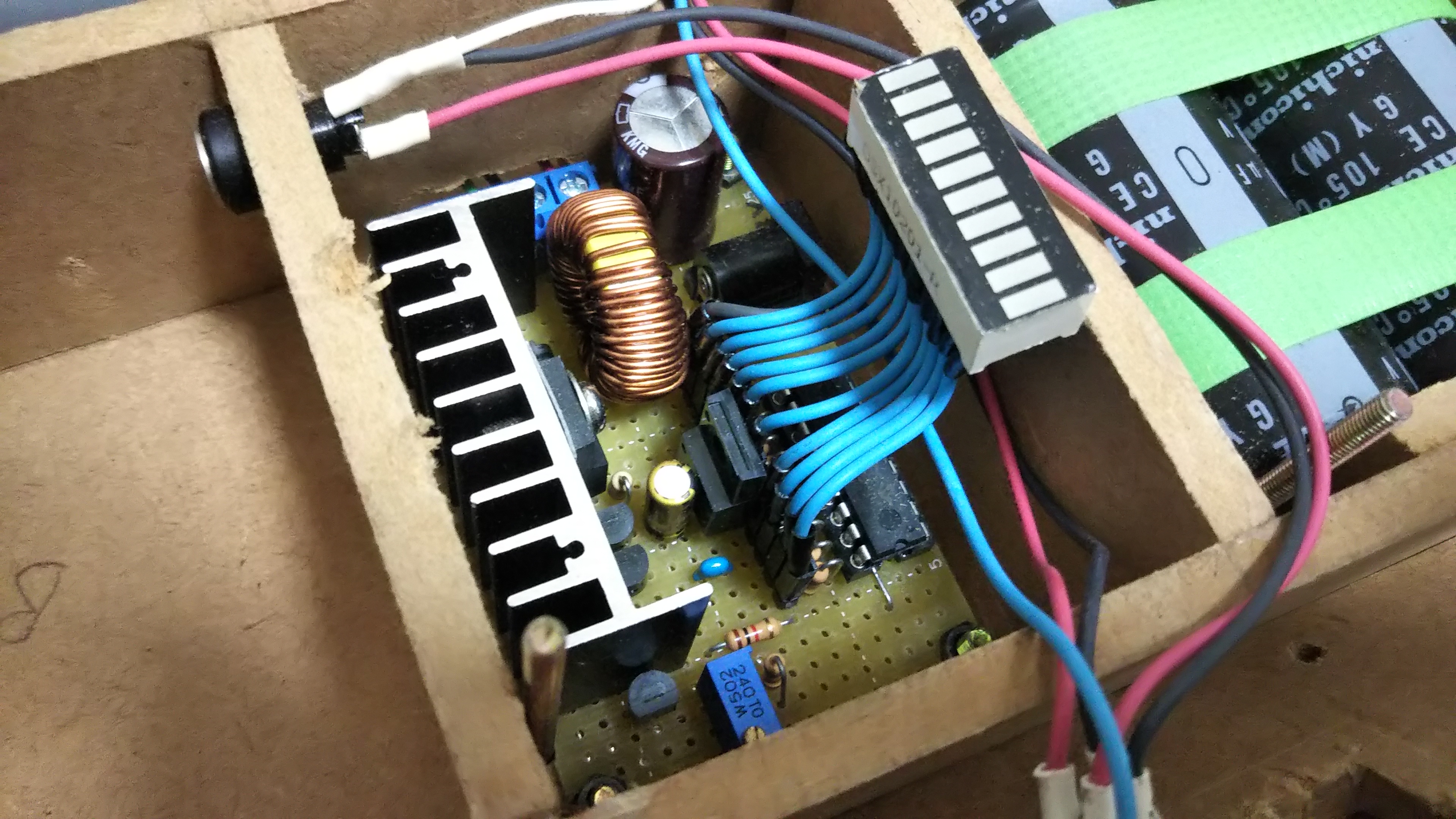 この蝶番のついた蓋を開けると鉛電池の格納場所が現れます。蓋の右にあるトグルスイッチは充電回路と発射回路の切り替えスイッチ(誤射防止用)で、その右にあるのは充電電圧確認用のLEDです。