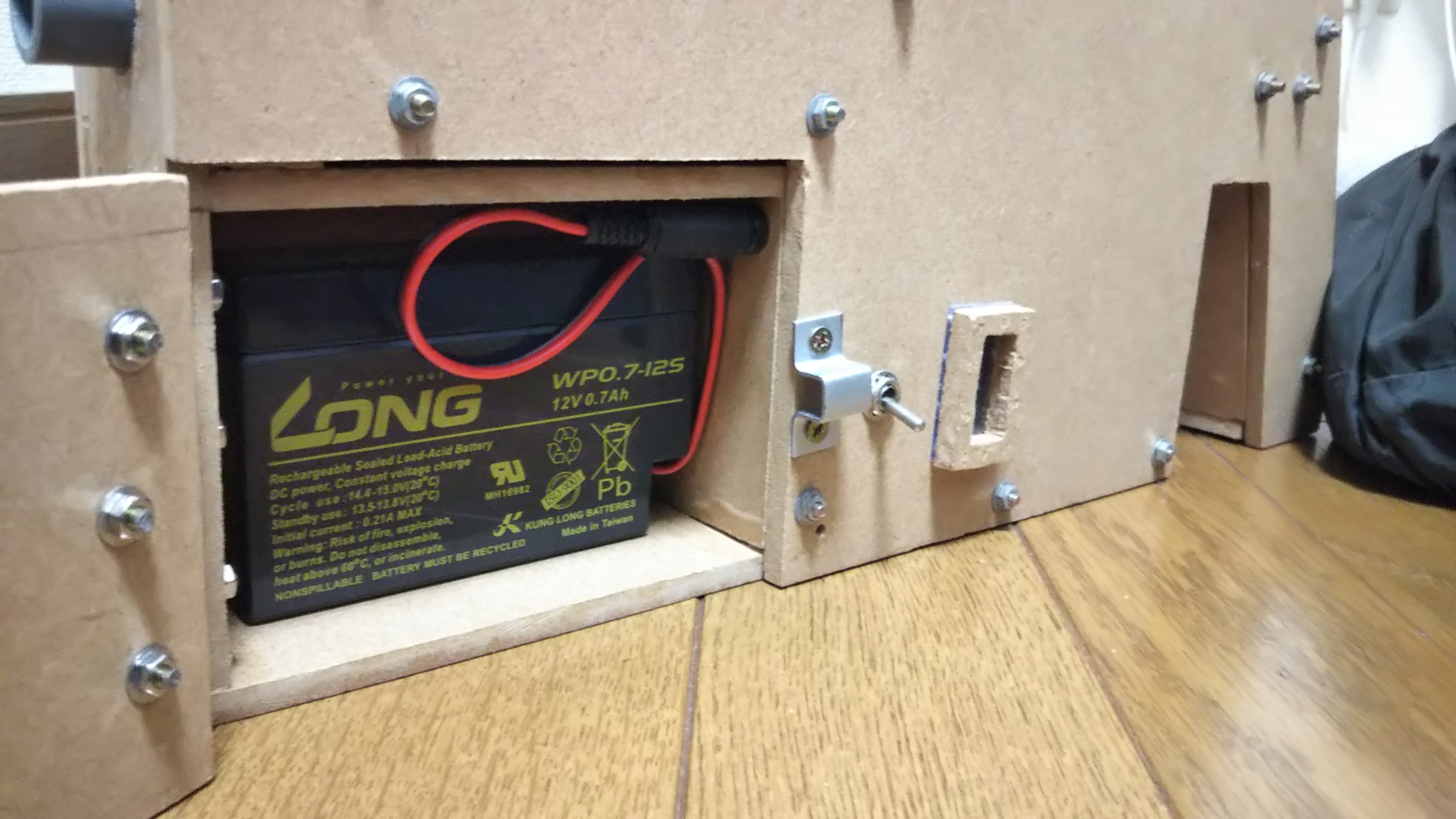 鉛蓄電池の格納場所です。12V0.7Ahの小型のものを使用しています。買ってきたときについていたコネクターは使いづらかったのでDCジャックのオスをはんだ付けして使っています。