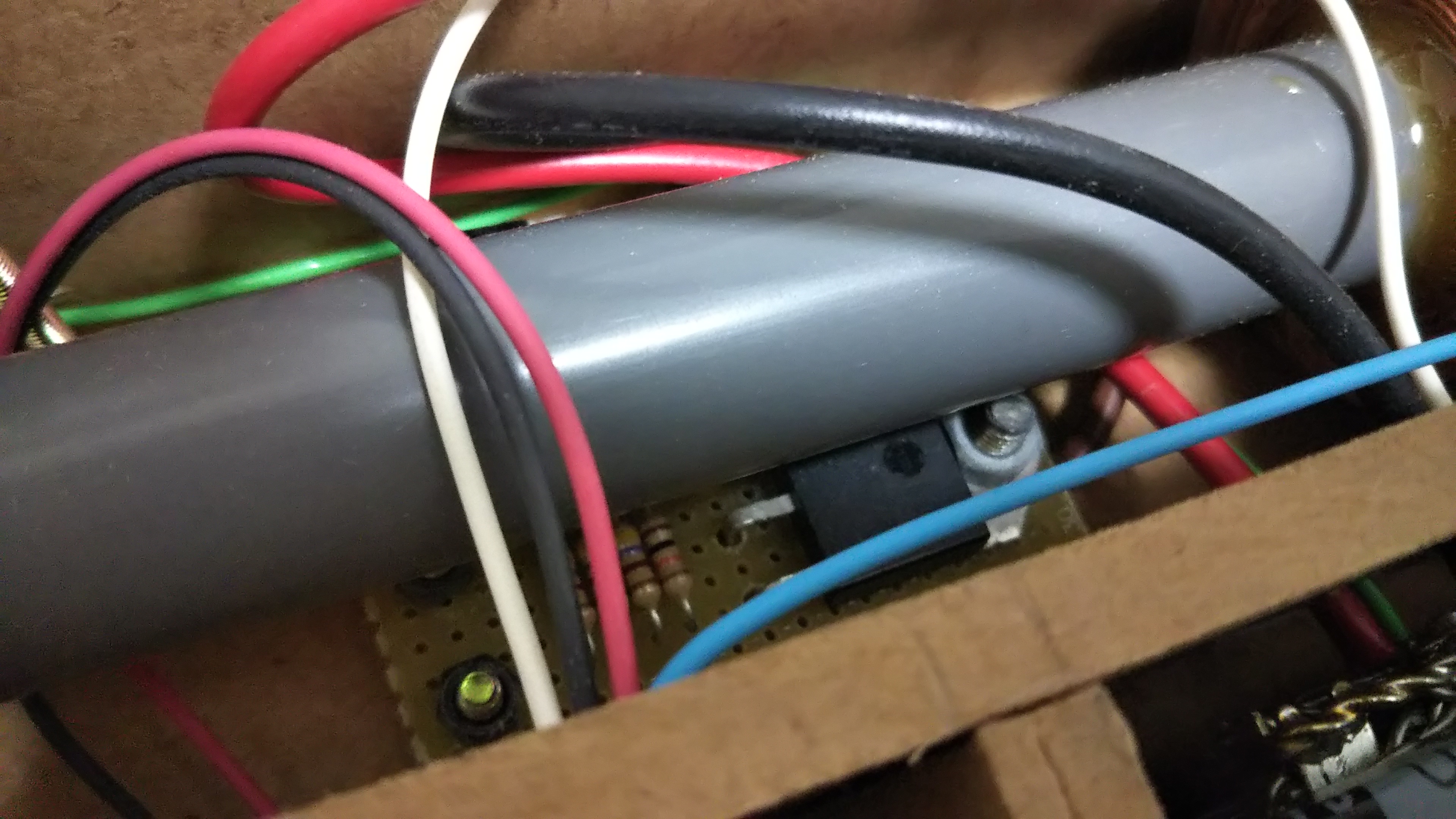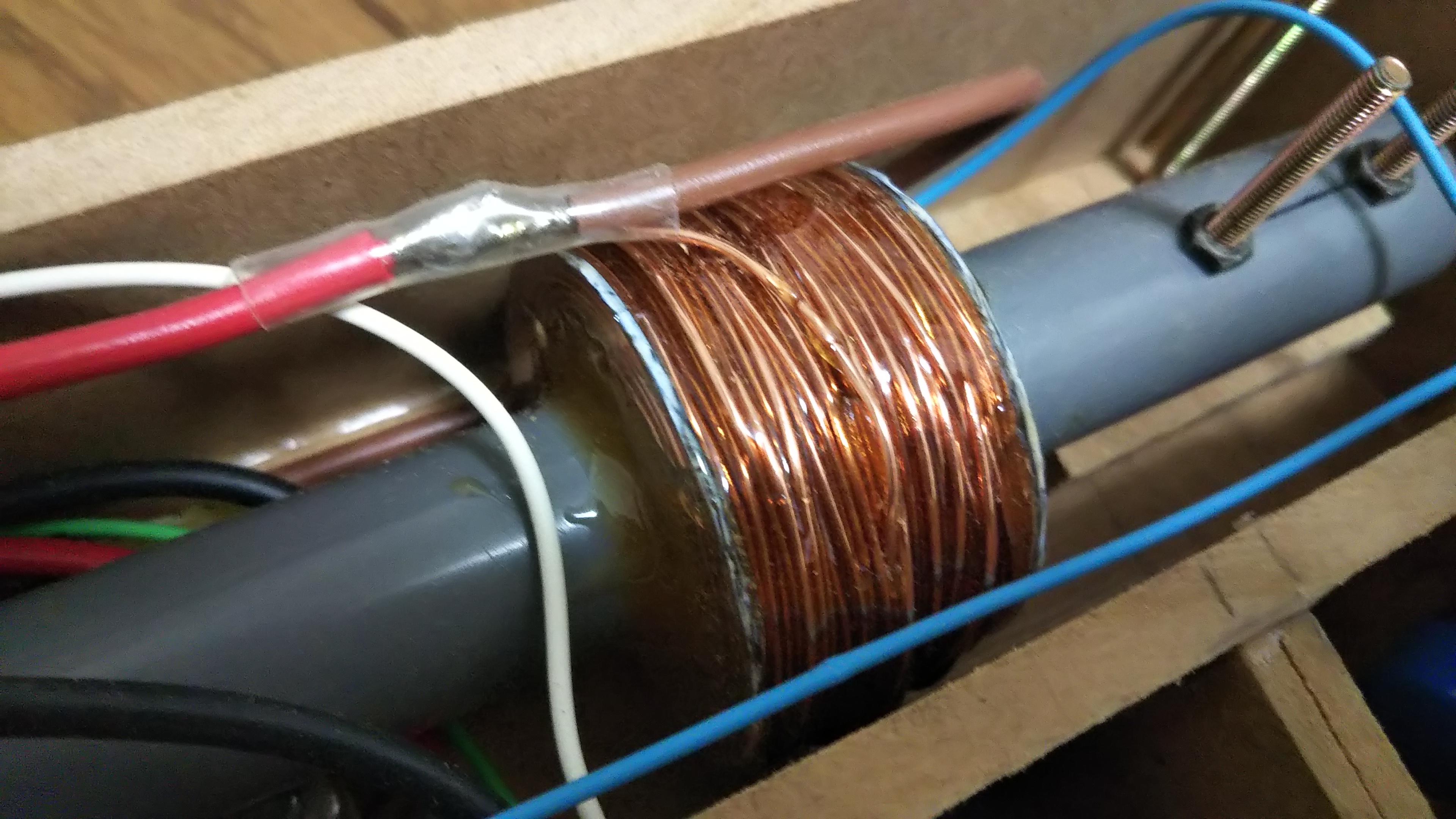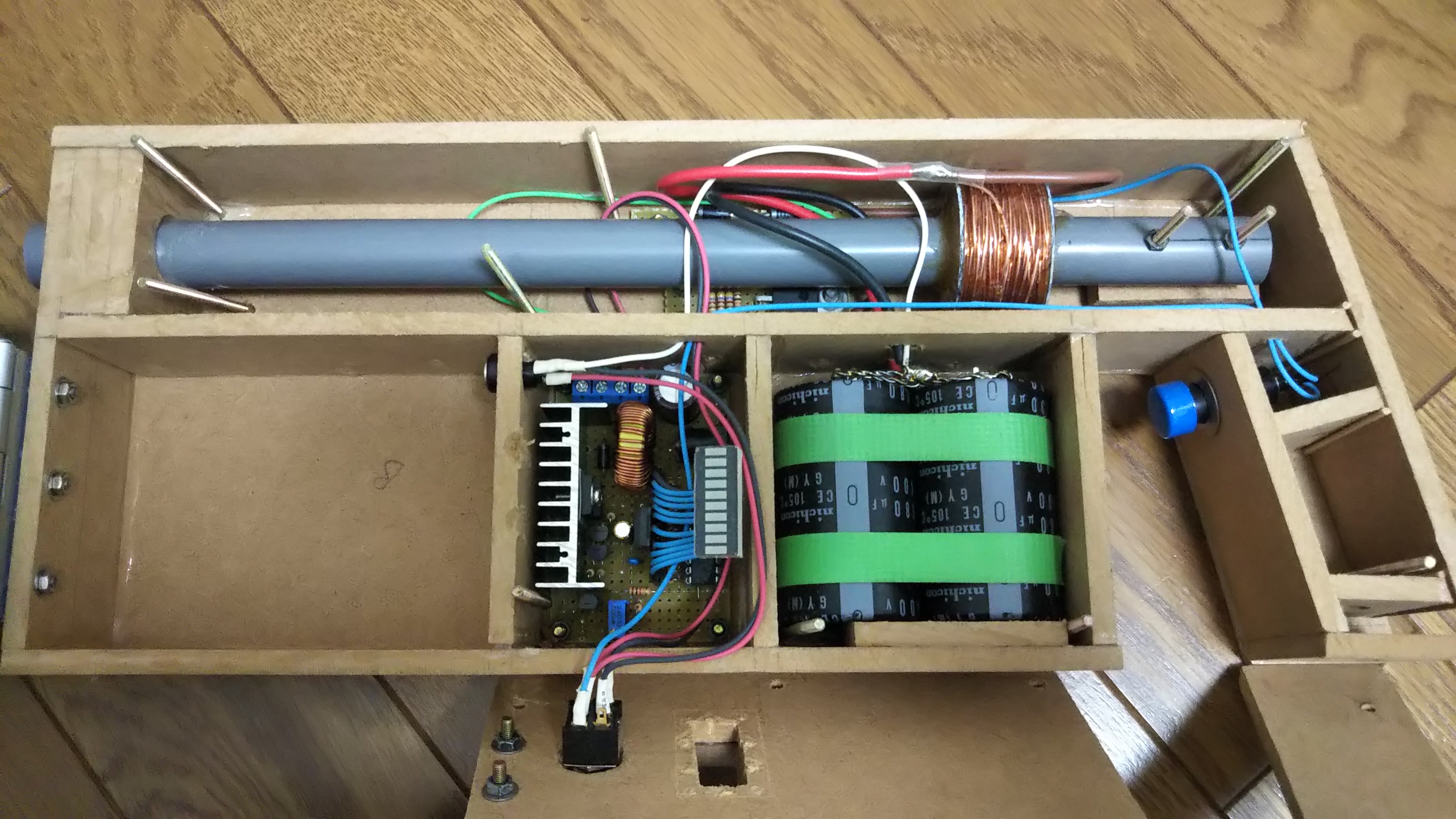 次は内側を見ていきます。上に長くあるのが銃身に相当する部分で、水道管にも使われている塩ビパイプを使用しています。本来はコイル半径は小さくしたいので弾はもっと小さいものを使うべきなのですが、鉄の小さい弾というのはなかなか見つからないものです。そこで私はたくさん用意できるパチンコ玉を飛ばすことにしたのですが、そうなるとどうしても太いパイプが必要になりこんな感じになりました。