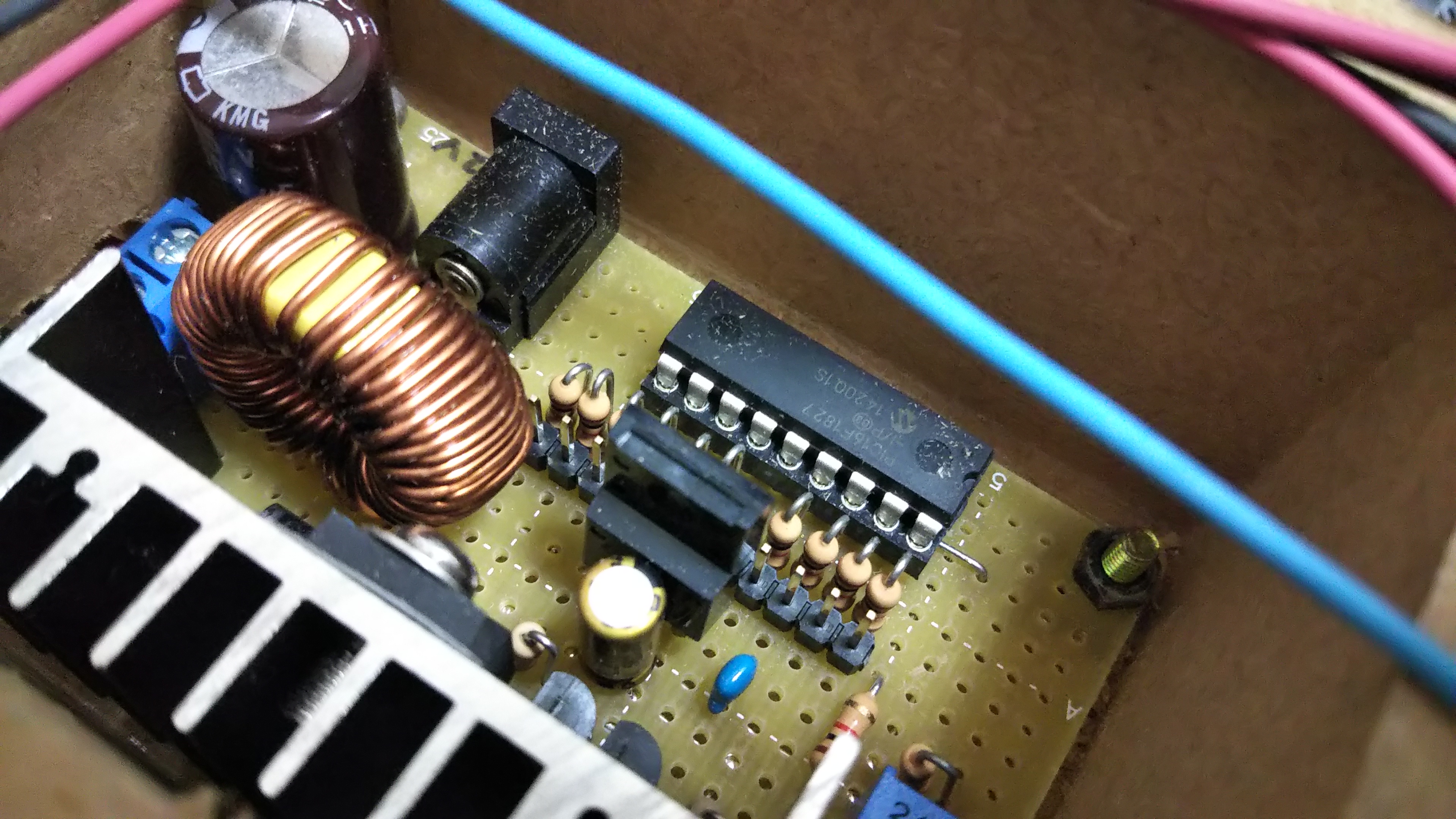 昇圧チョッパ回路です。MOS-FETには放熱板が取り付けられています。電源は12Vですが、マイコンの動作電圧は5Vなので3端子レギュレータで降圧したものをマイコンに供給しています。また、下に見える青い可変抵抗で出力電圧の分圧比を変更し、マイコンに入力する電圧を変化させることでドライバーだけで充電電圧を変えられるようにしています。