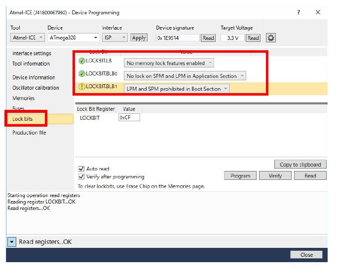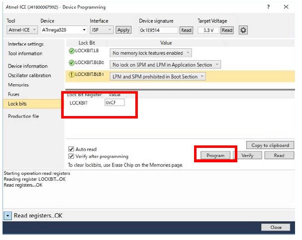 同ページ、Lock Bit Registerの下記の表示を確認して、[Program]ボタンをクリックします。