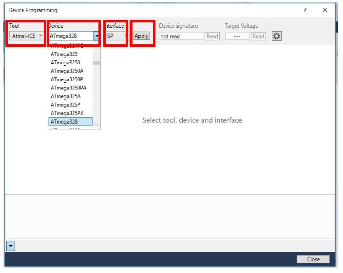 Toolから「Atmel-ICE ..」を、Deviceから「ATmega328」を、Interfaceから「ISP」を選択し、[Apply]ボタンをクリックします。