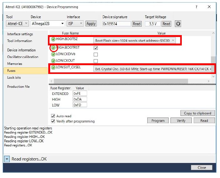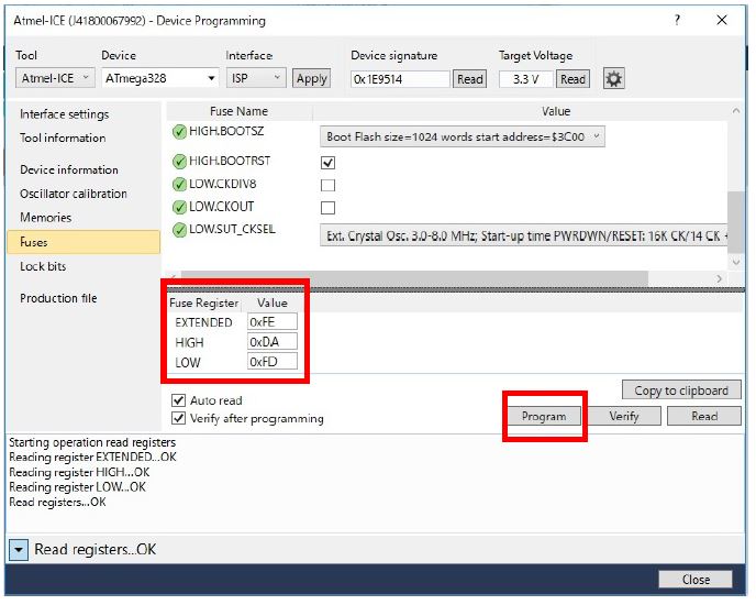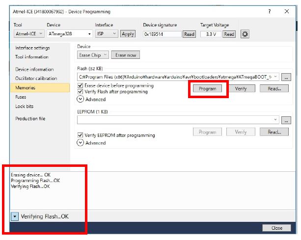 同ページで[Program]ボタンをクリックすると、マイコンへのBootloaderが書き込み実行されます。Verifying Flash....OKの表示されていれば完了です。