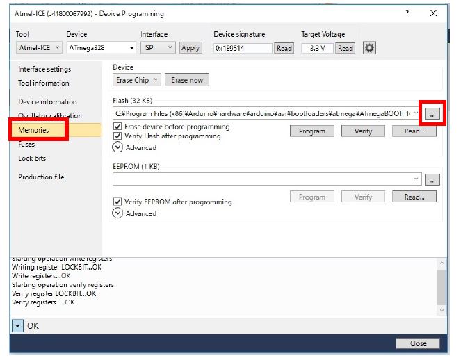 [Memories]ページを開き、Flash(32KB)の […]ボタンをクリックして、Arduinoが保存されているCドライブから、下記のHEXファイルを選択します。