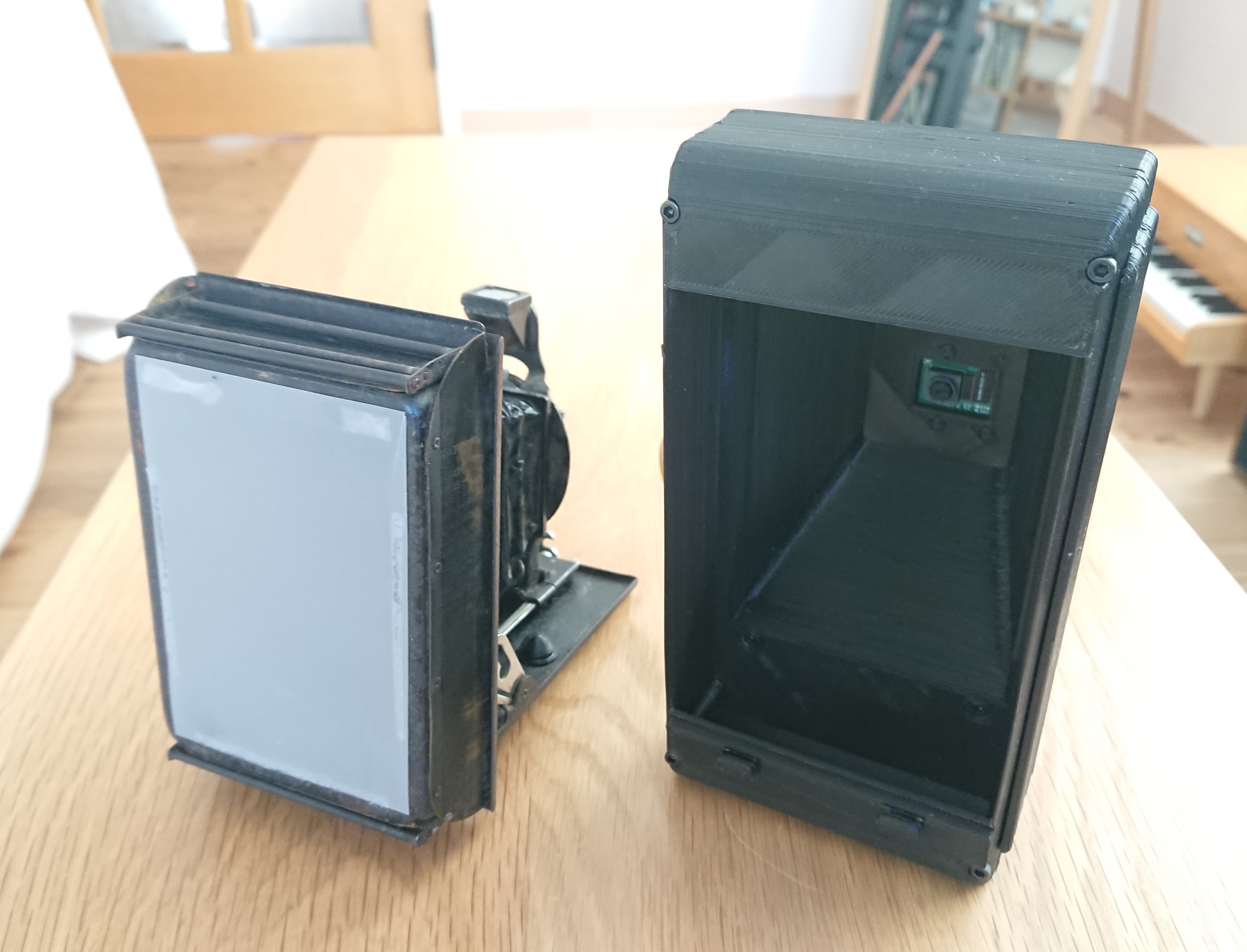 本来のカメラは、蛇腹レンズ部とフィルムを収納するボディの2分割構造となっています。今回はボディ部を3Dプリンタで作り直し、RaspiCameraを設置する暗箱部を制作しました。カメラを制御するRaspberryPiZero2Wを載せるブラケットも3Dプリンタで制作しています。