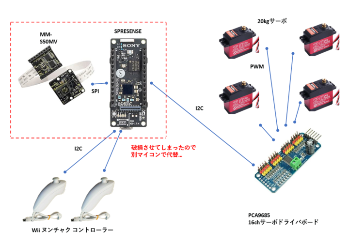 また、サーボモーター駆動用のマイコンピン数削減のため、別途でI2C通信によるサーボモータードライバボードを使用し、サーボモーターはそちらに接続するものとします。