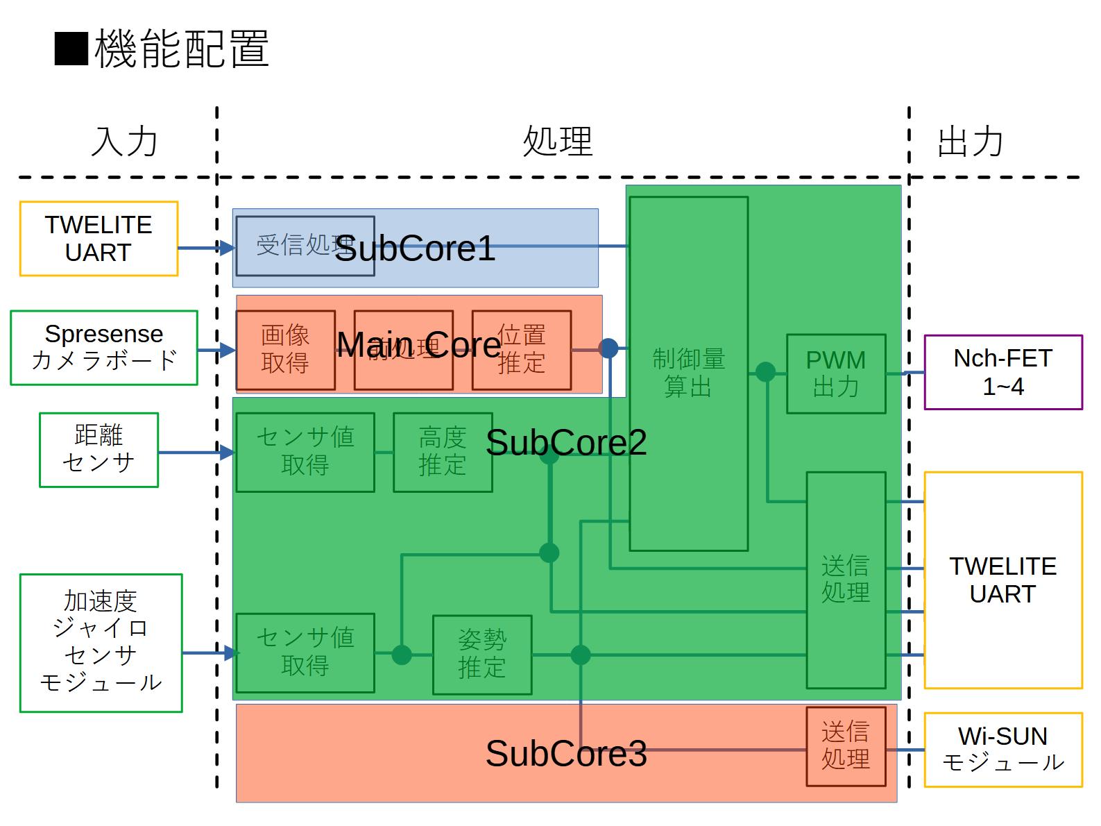 機能配置にはハードウェアの制約がかかわってくる。Arduino IDEで開発するとき、カメラ関係はMain Coreでしか操作できないためカメラの前処理と位置推定はMain Coreに配置してそれ以外はSub Coreに配置している。