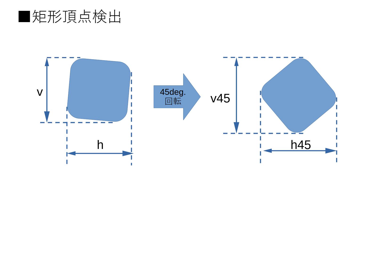 頂点検出は下記図の通り、各領域の水平垂直の最大最小値の4点と画像を45度回転させたときの4点を比較し、対角位置の頂点距離v、hとv45、h45で最も大きいほうを選択するようにした。