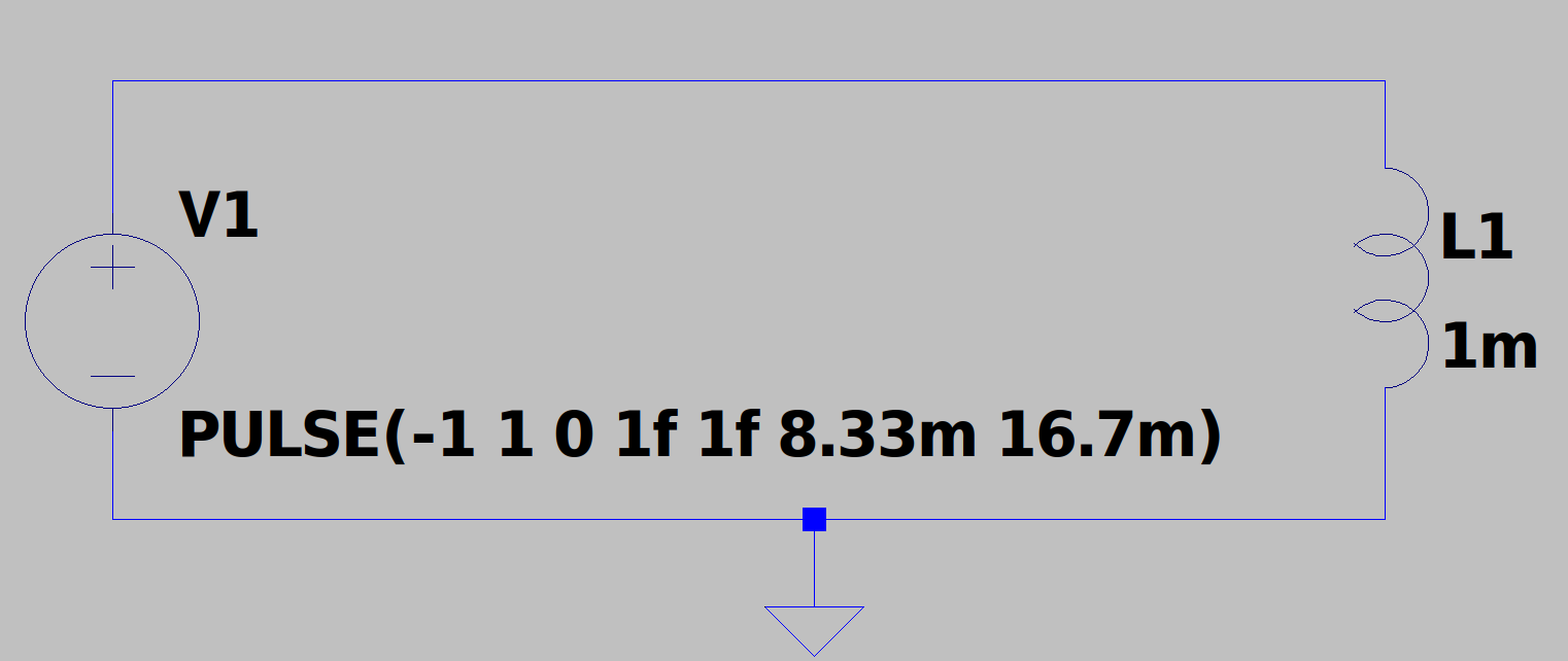 では、正負に1[V],60[Hz]の対称矩形波を1[mH]のコイルに印加したときのコイルに流れる定常時の電流i(t)を、フーリエ級数とリアクタンスを用いて計算せよ。