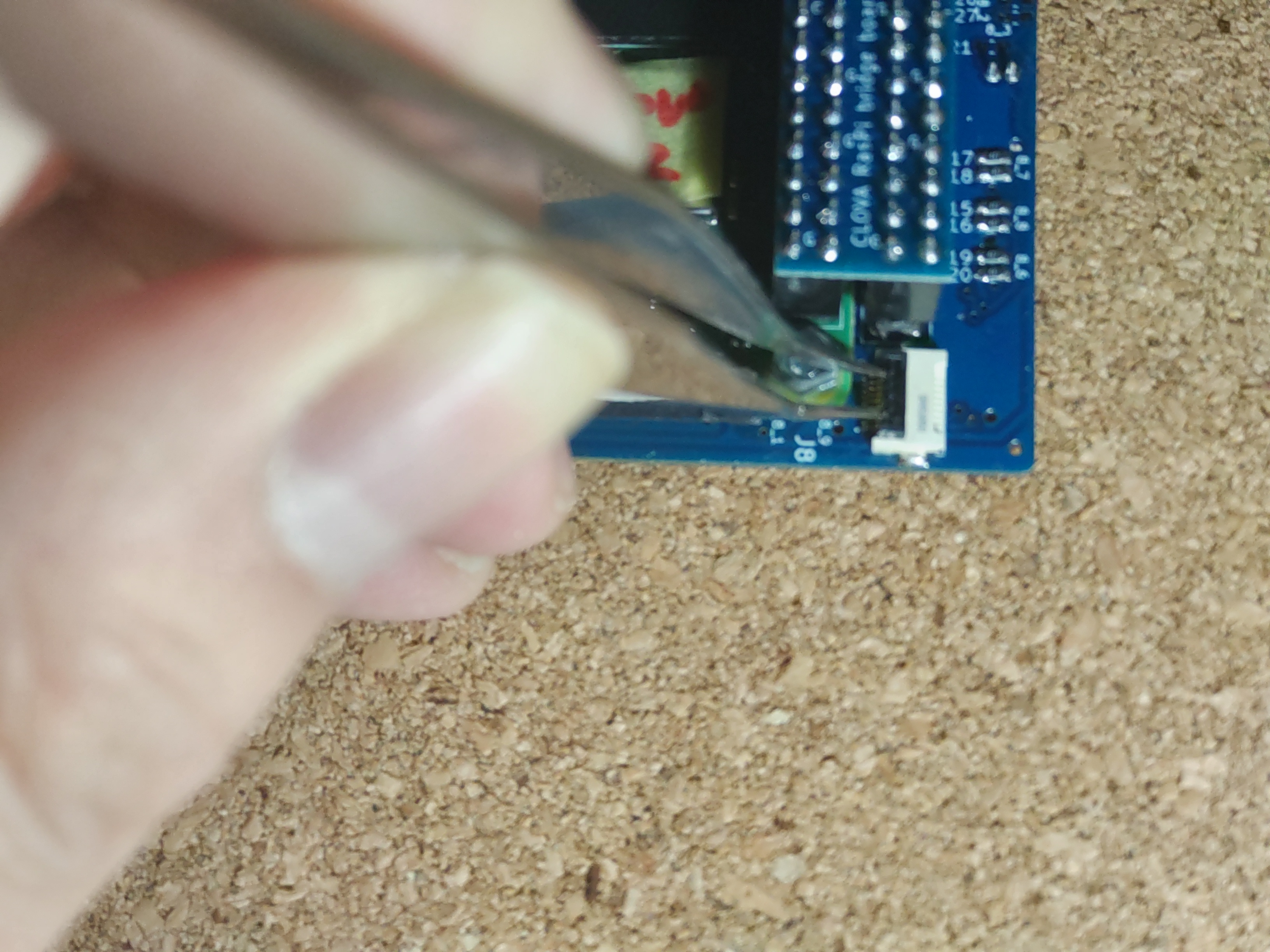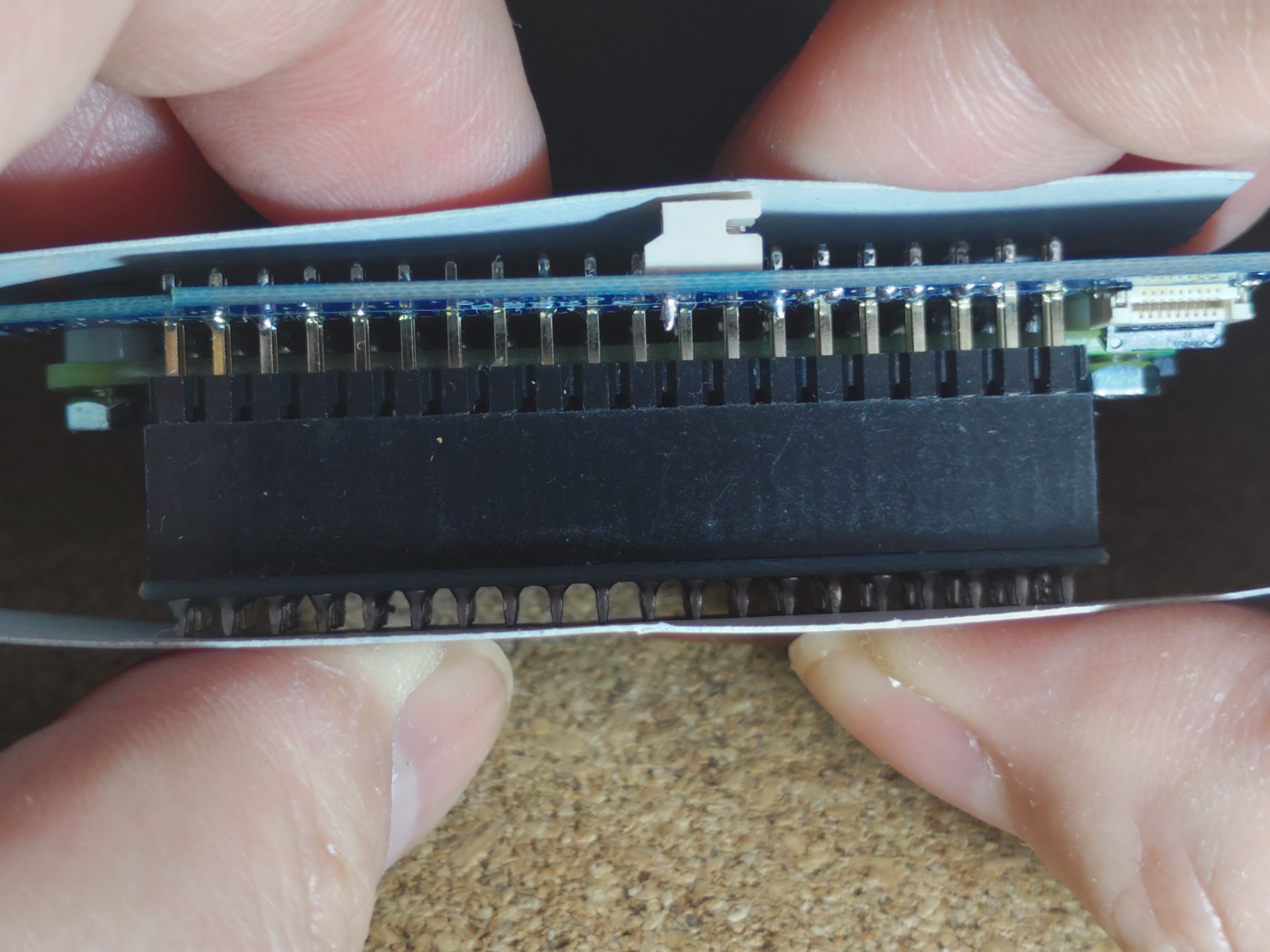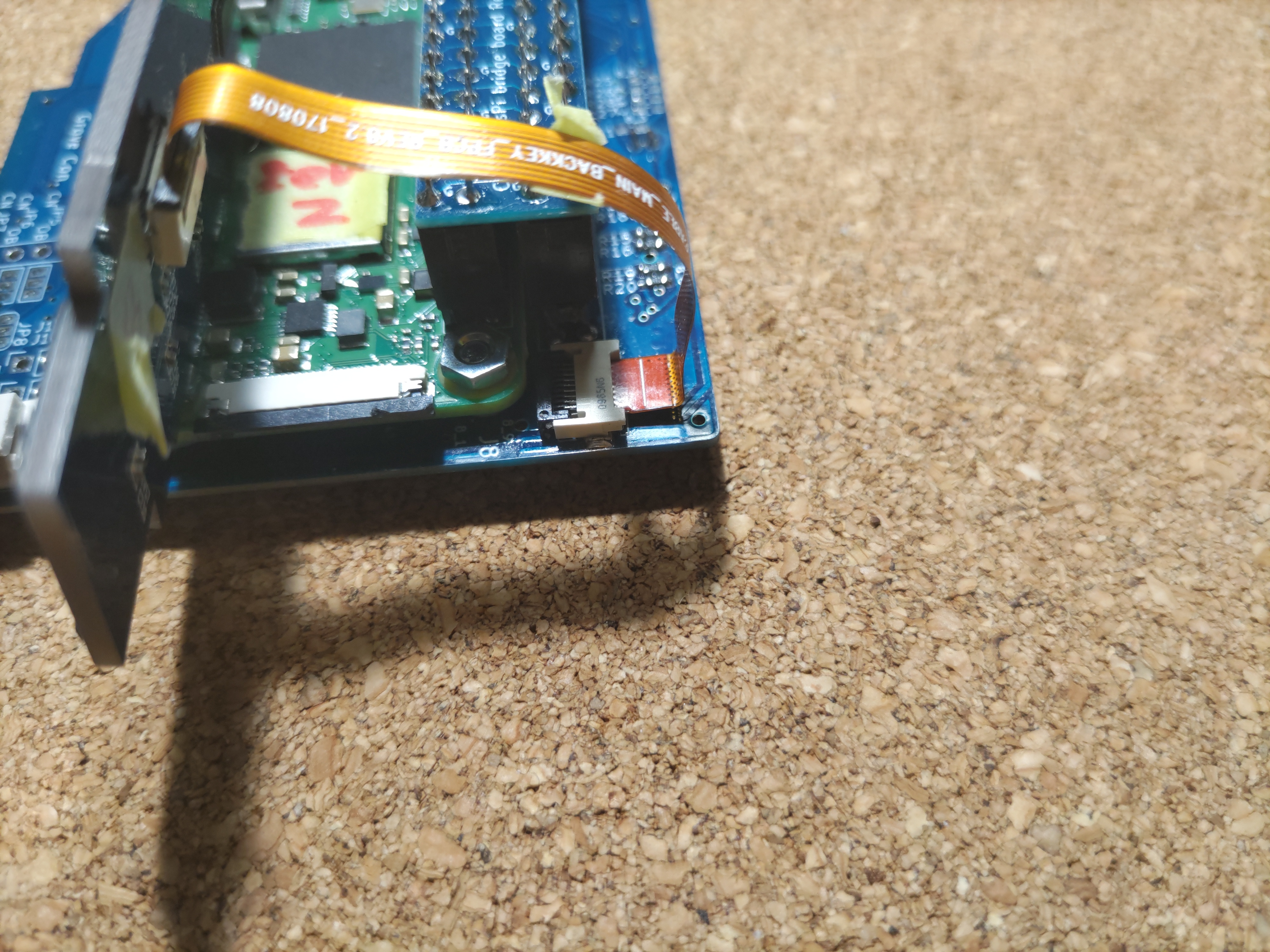 奥まで入る直前、フラットケーブルが邪魔になると思います。ここまでくると抜けないはずなので、仮止めしていたマスキングテープを外してケーブルを引っ張りつつ奥まで入れます。