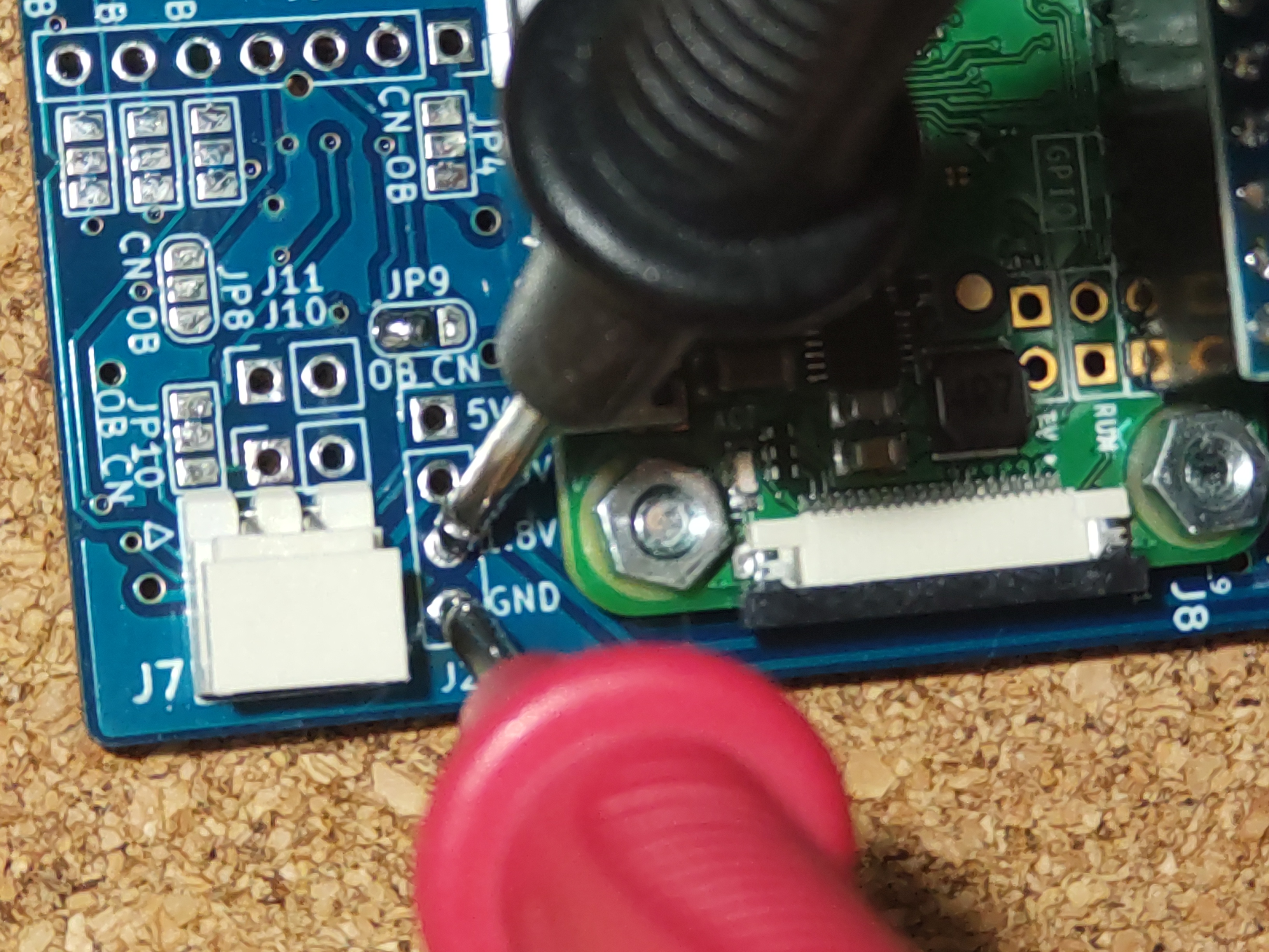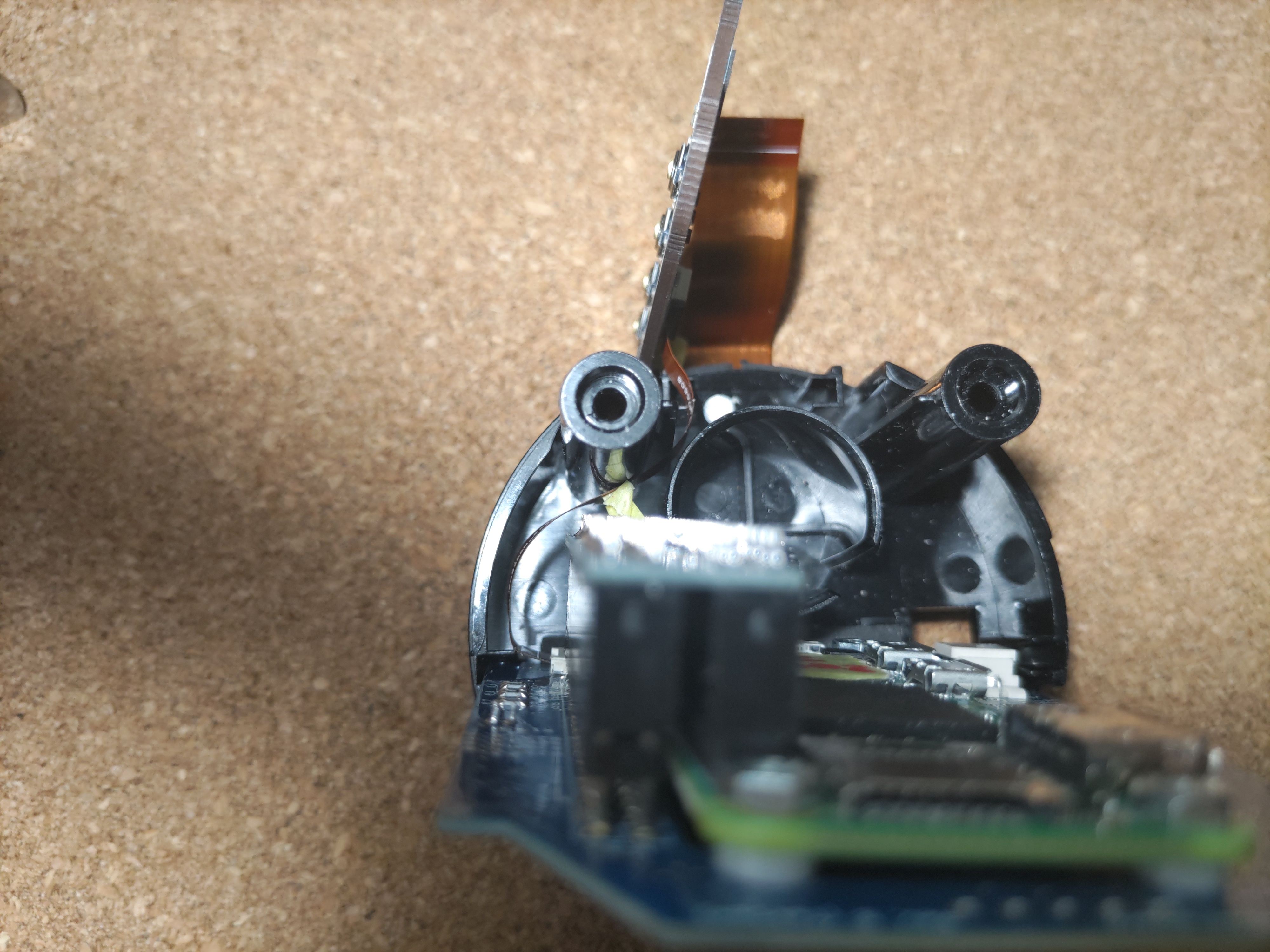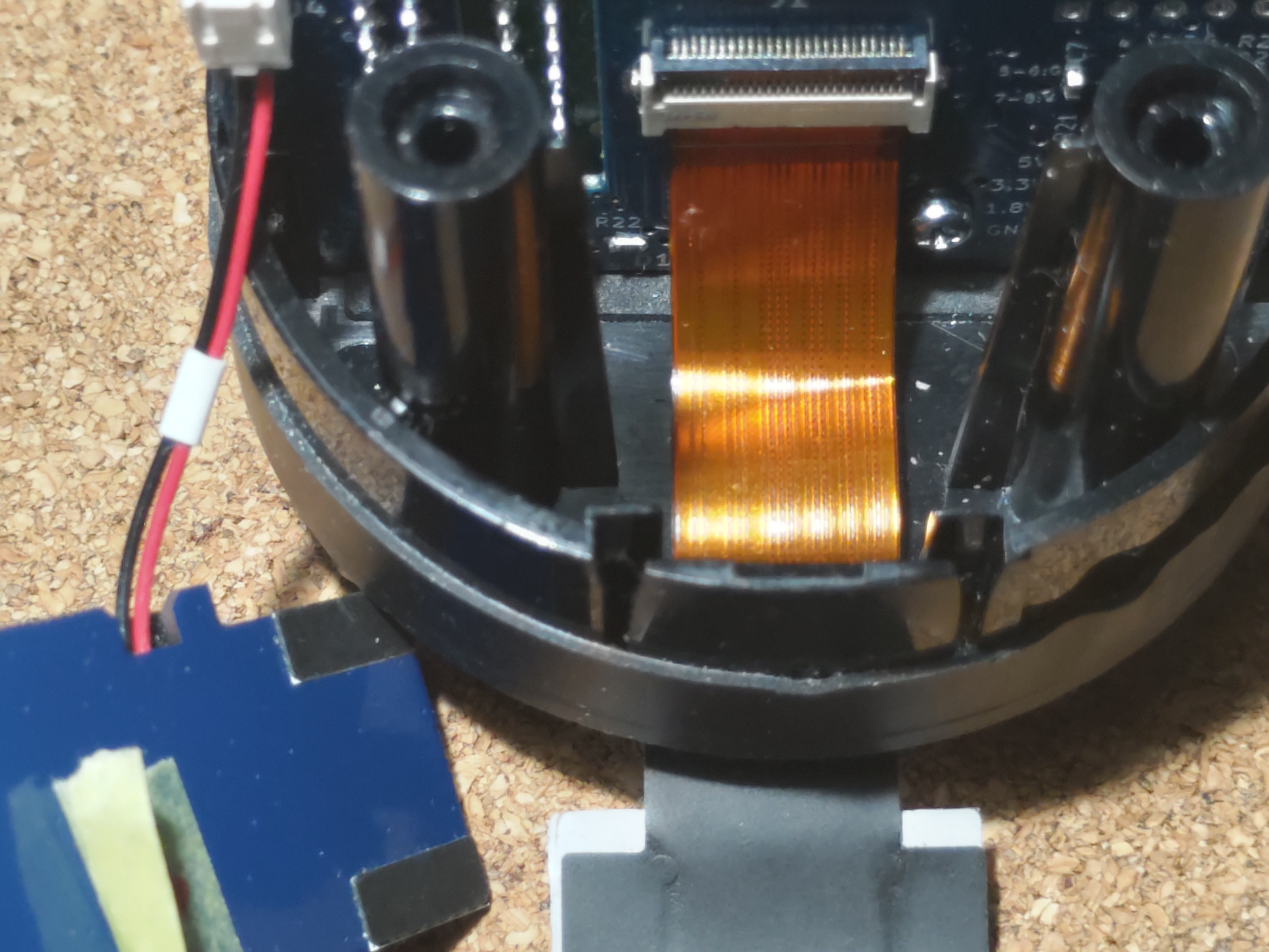 奥まで入る直前、フラットケーブルが邪魔になると思います。ここまでくると抜けないはずなので、仮止めしていたマスキングテープを外してケーブルを引っ張りつつ奥まで入れます。