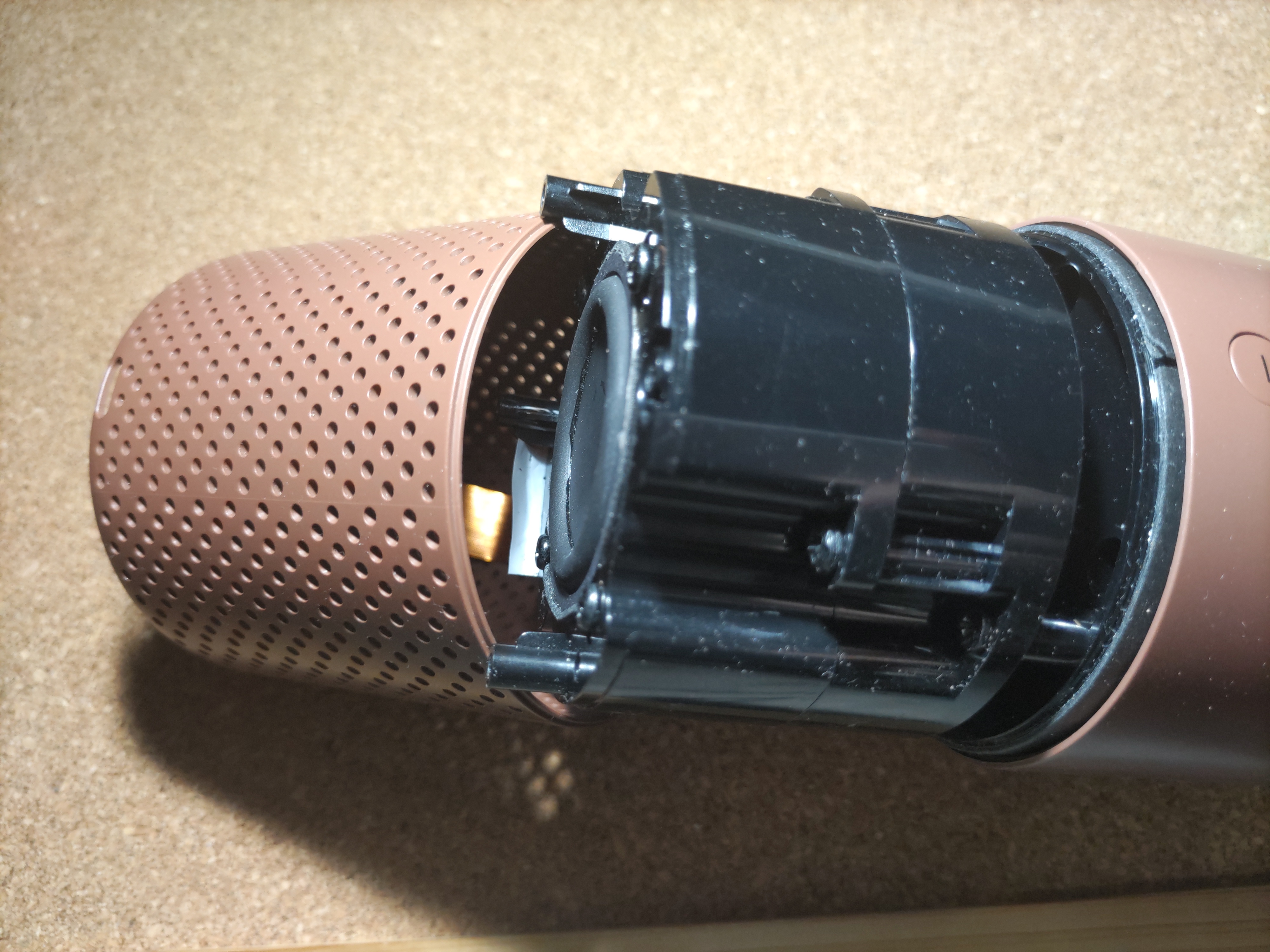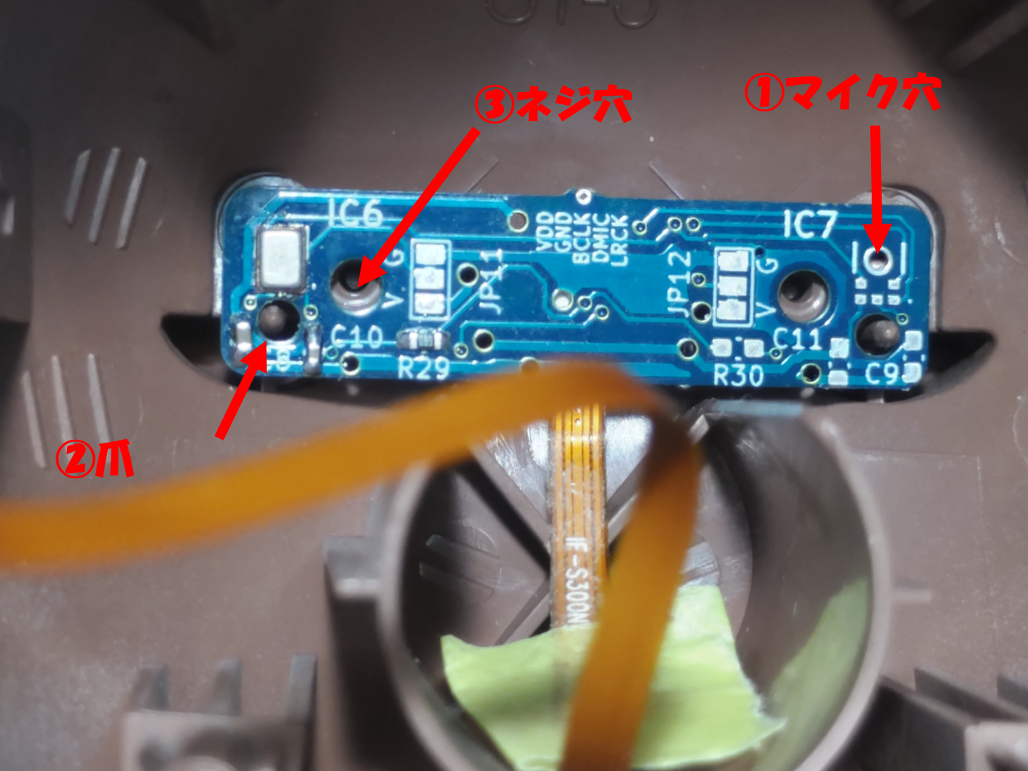 頭部をそっと上方向に引っ張ると、頭部ケース部分が抜けます。中にはマイク基板からのケーブルが通っていますので勢いよく引っ張ってケーブルを破損しない様にしましょう。